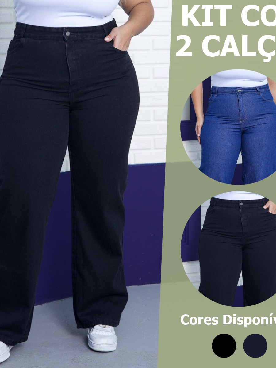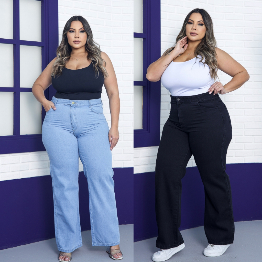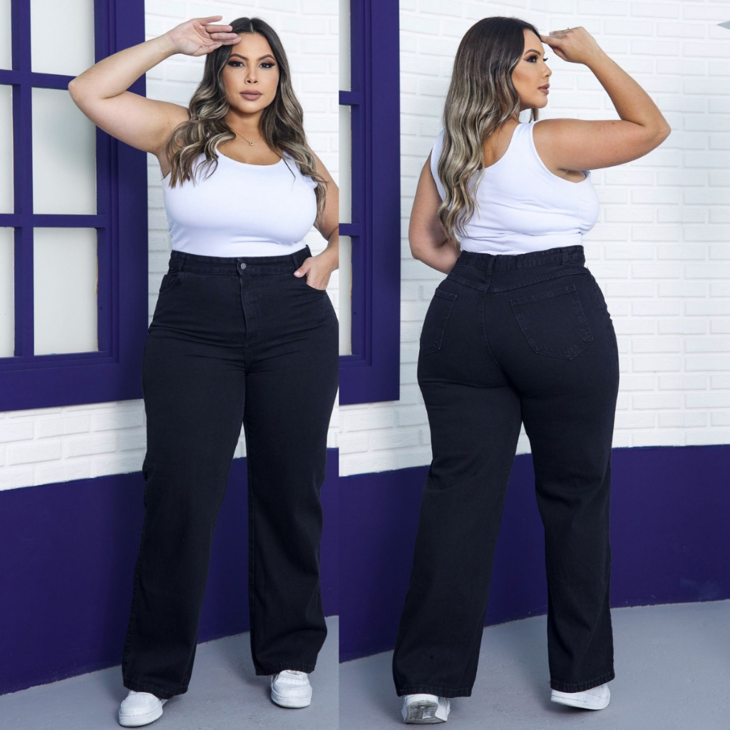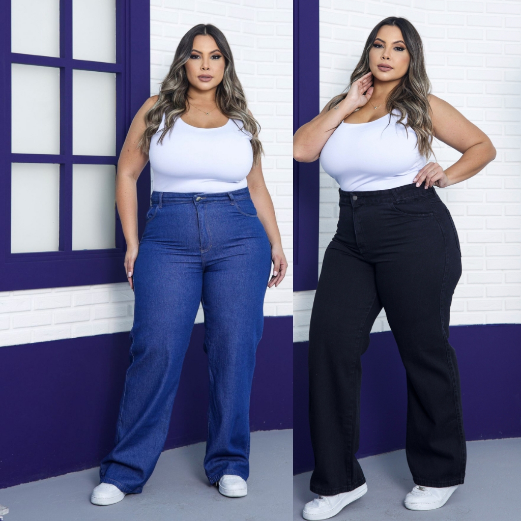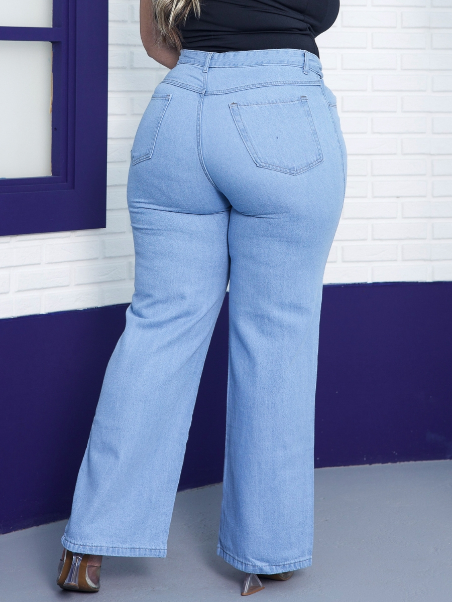 Calça Wide Leg Plus Size Jeans Feminina Cintura Alta Pantalona Moda Casual