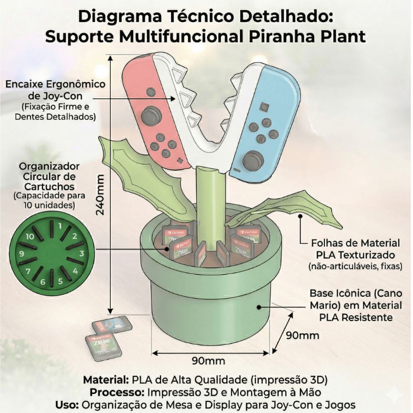 Suporte Controle Nintendo Switch Joy-Con Porta 10 Jogos Planta Carnivora Mario Bros Decorativo Gamer
