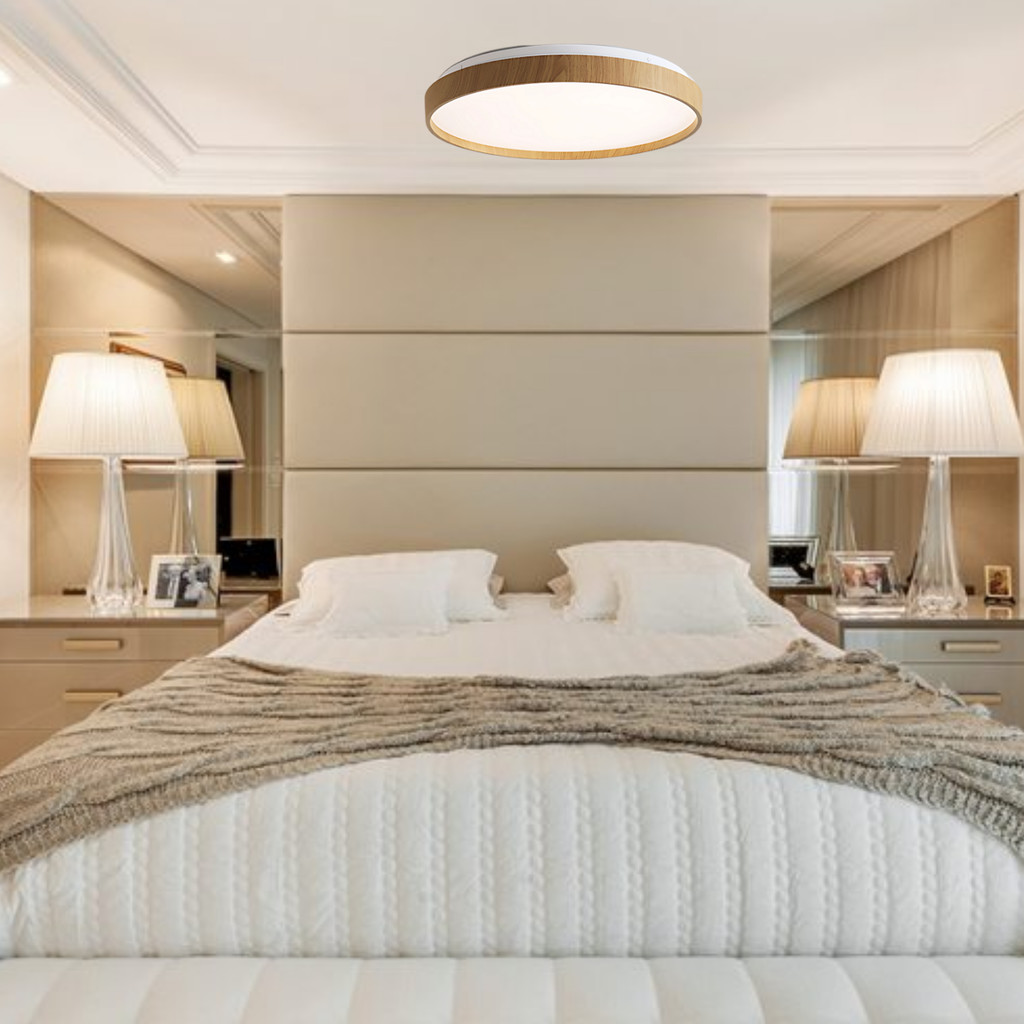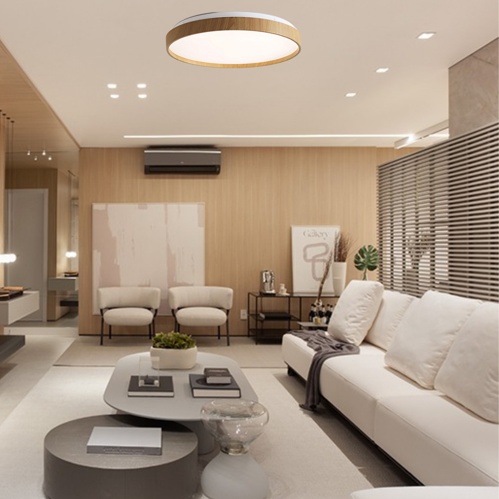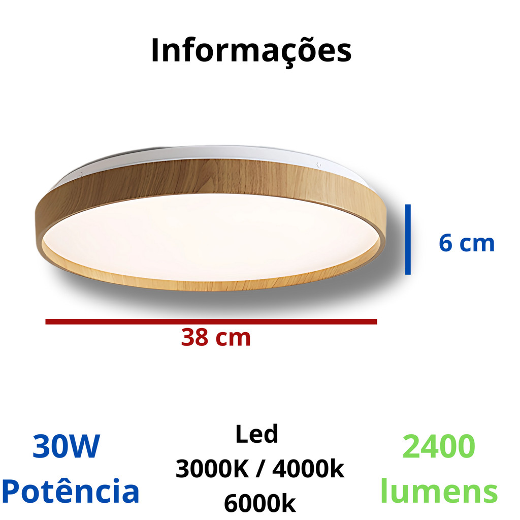Plafon Luminária Space Madeira 30W 38cm Redondo Sobrepor Efeito Estrelado Led 3 Cores de Luz em 1