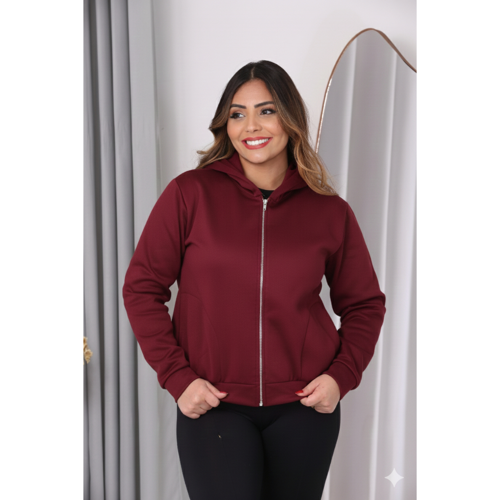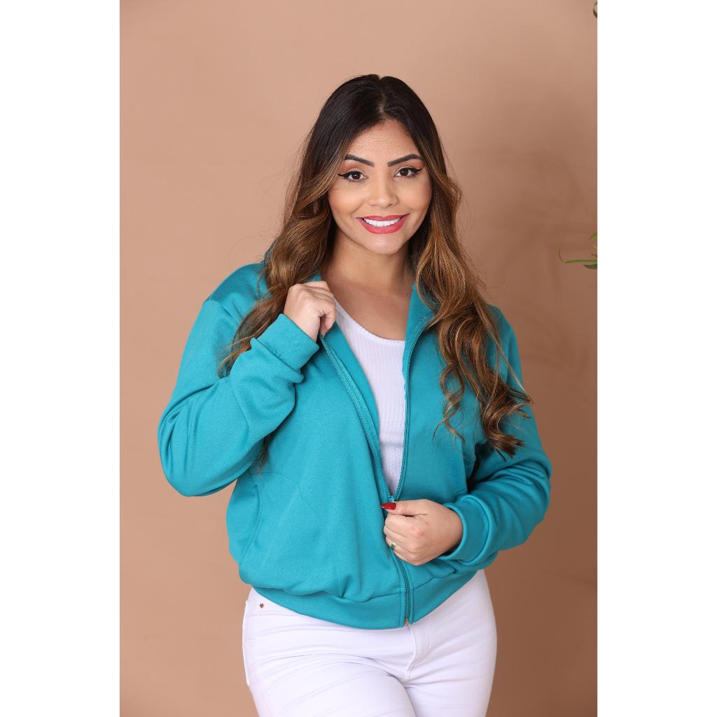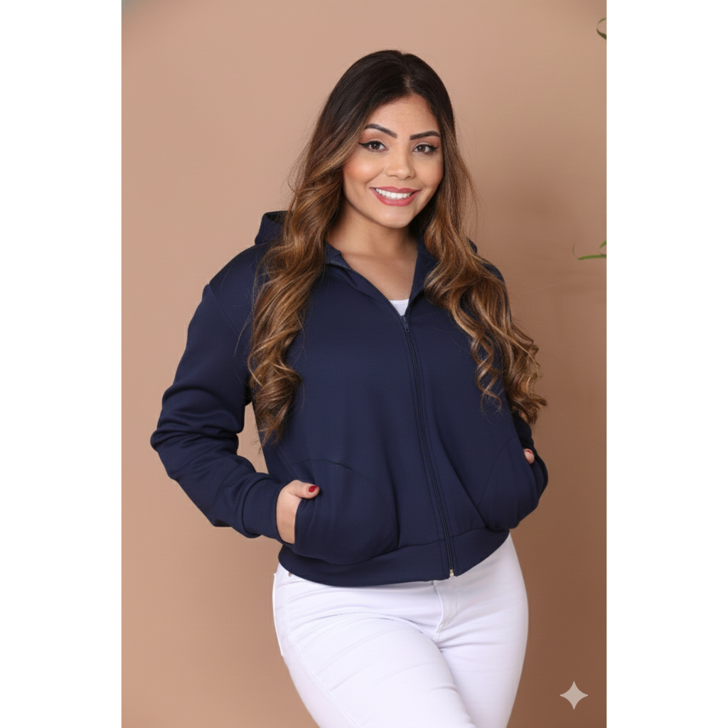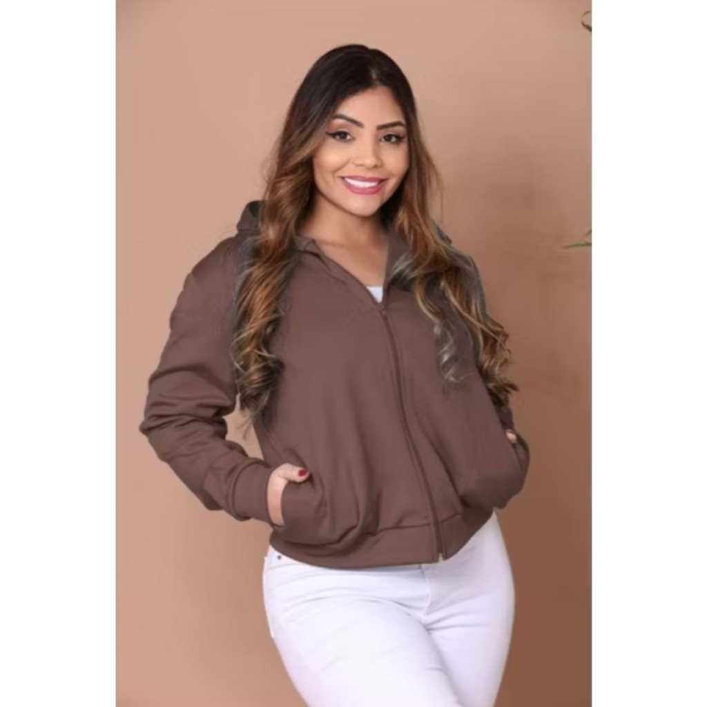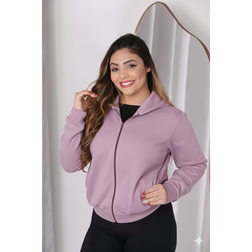 Casaco Moletom Femenino Liso com Capuz, Bolso nas Laterais e Ziper