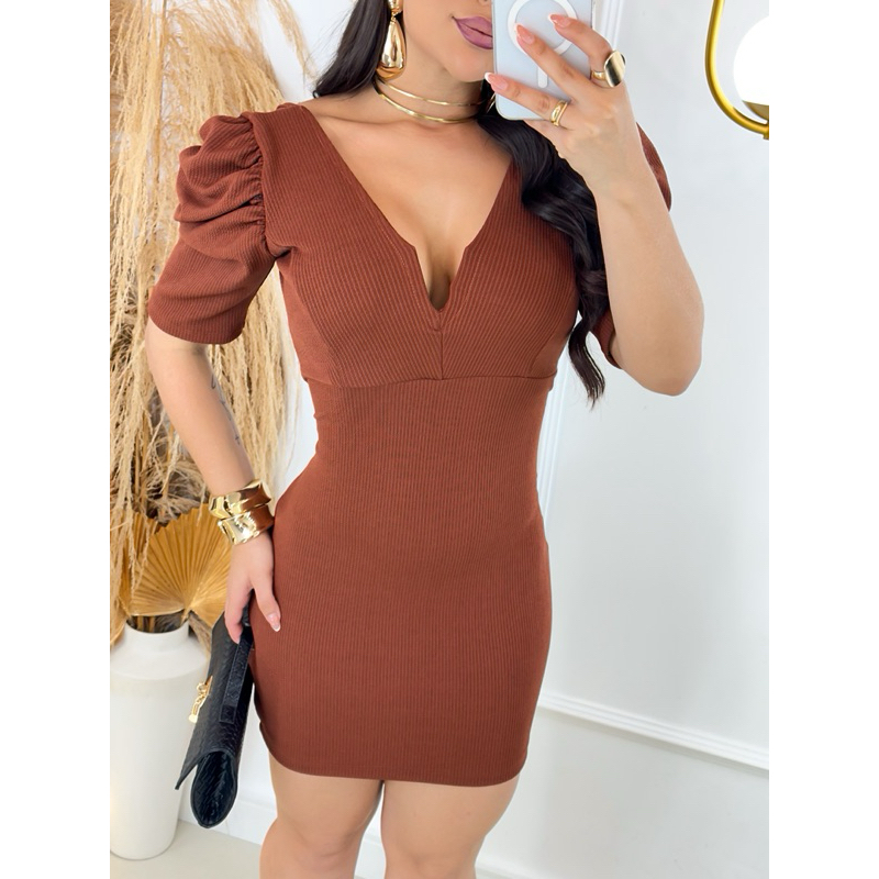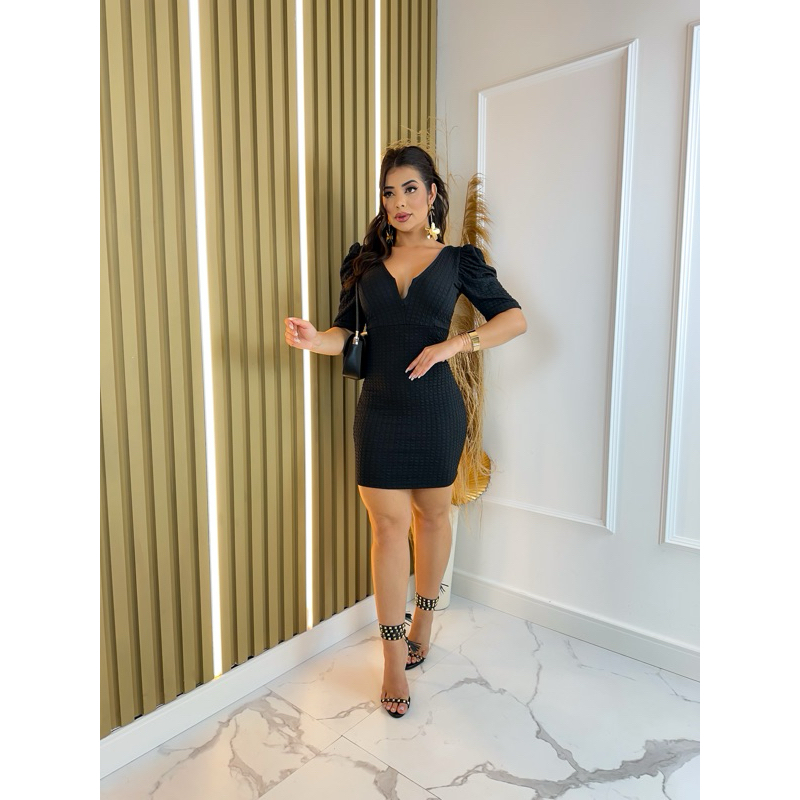 Vestido Feminino Ana Ruga Com Poderoso Aro de Metal Em V Valoriza o Decote Manga Princesa Bufante