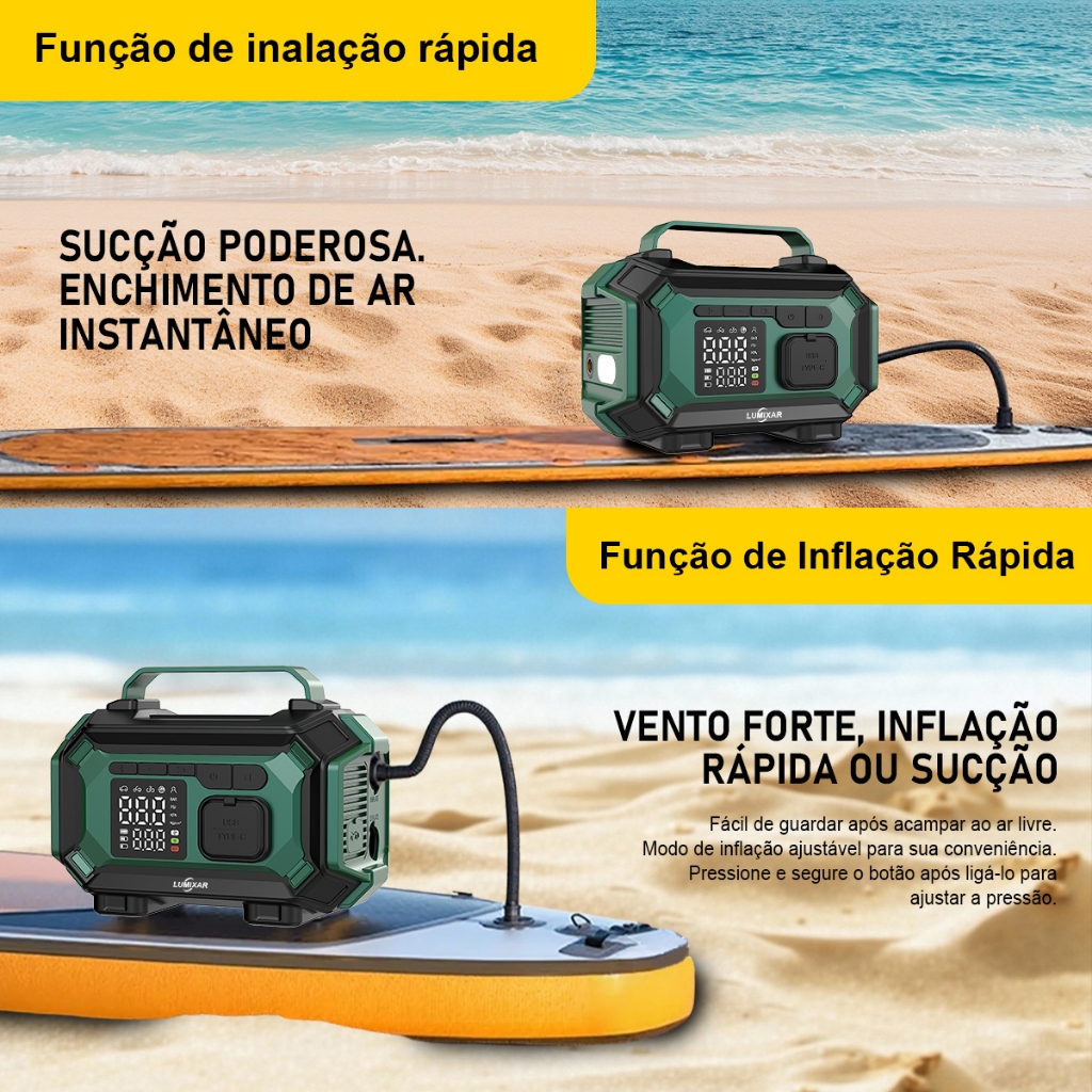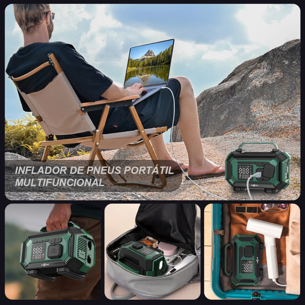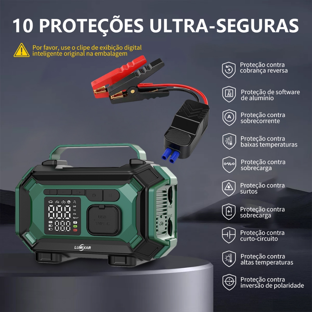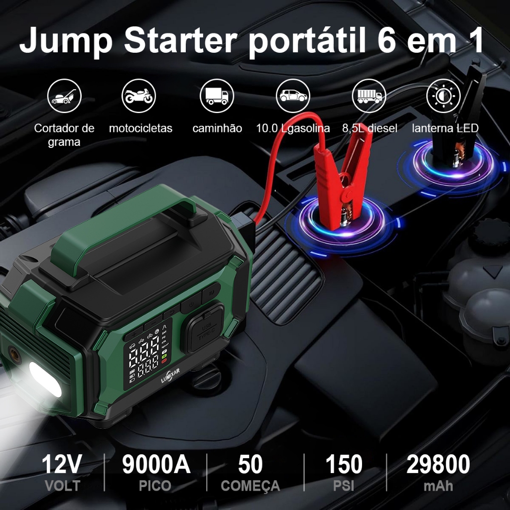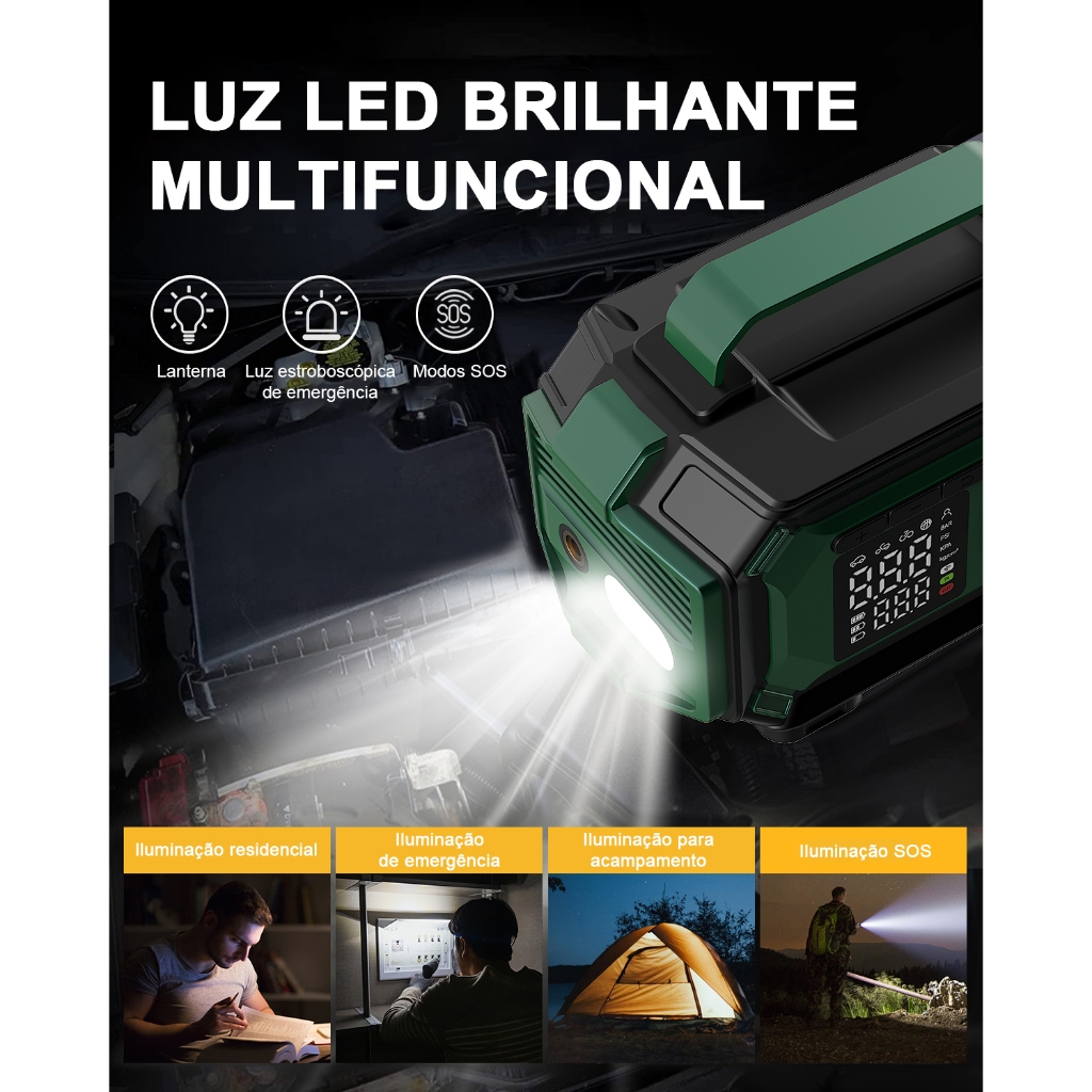 Auxiliar de Partida e Compressor de Ar Portátil 12V – Multifuncional com Carregador USB e Lanterna para Carros e Motos