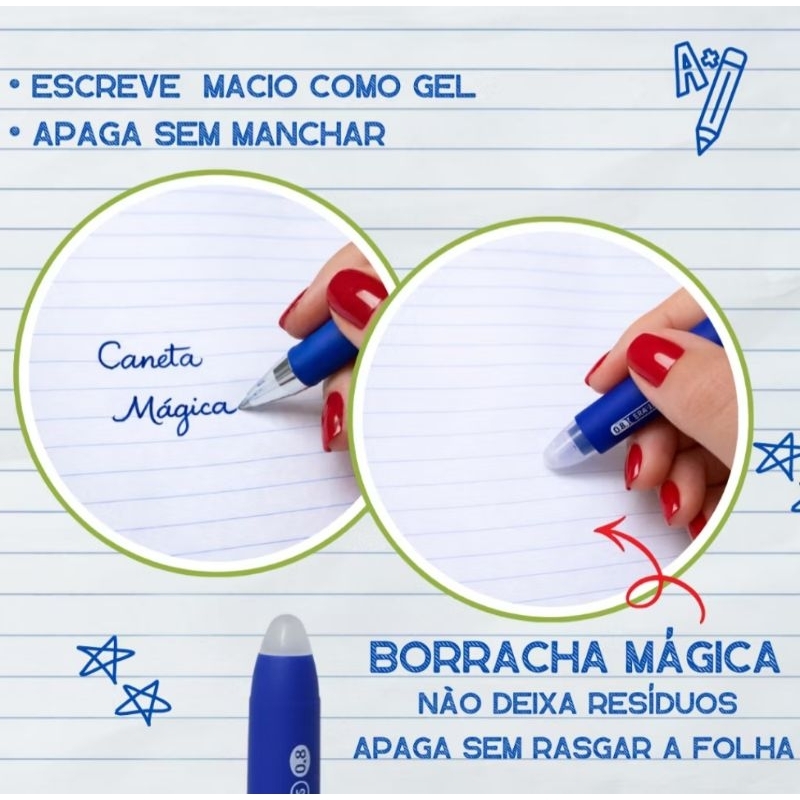 Caneta Apagável Mágica 0.8mm Kit 5 Unidades Tinta Gel Apaga com Fricção ou Calor Costura Tecido Escola Escritório