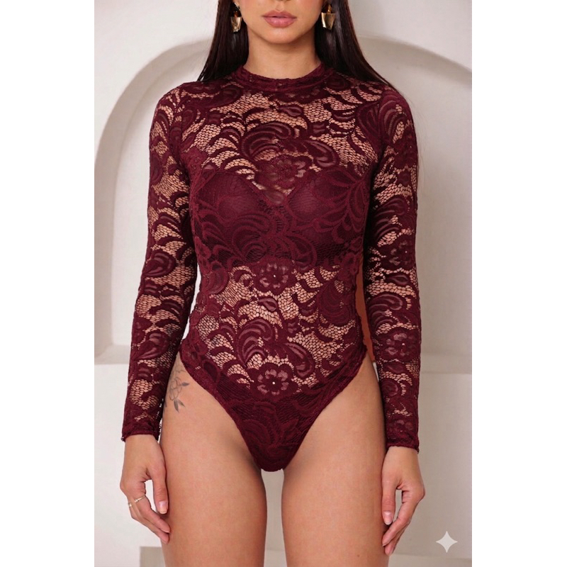 Body Feminino Renda Manga Longa Gola Alta Sexy Elegante Transparente Inverno Festa