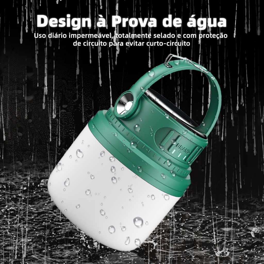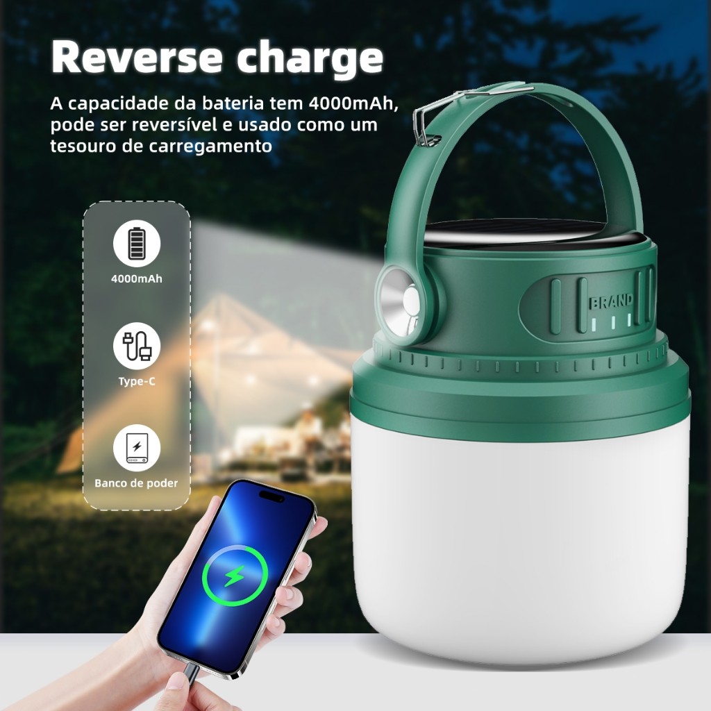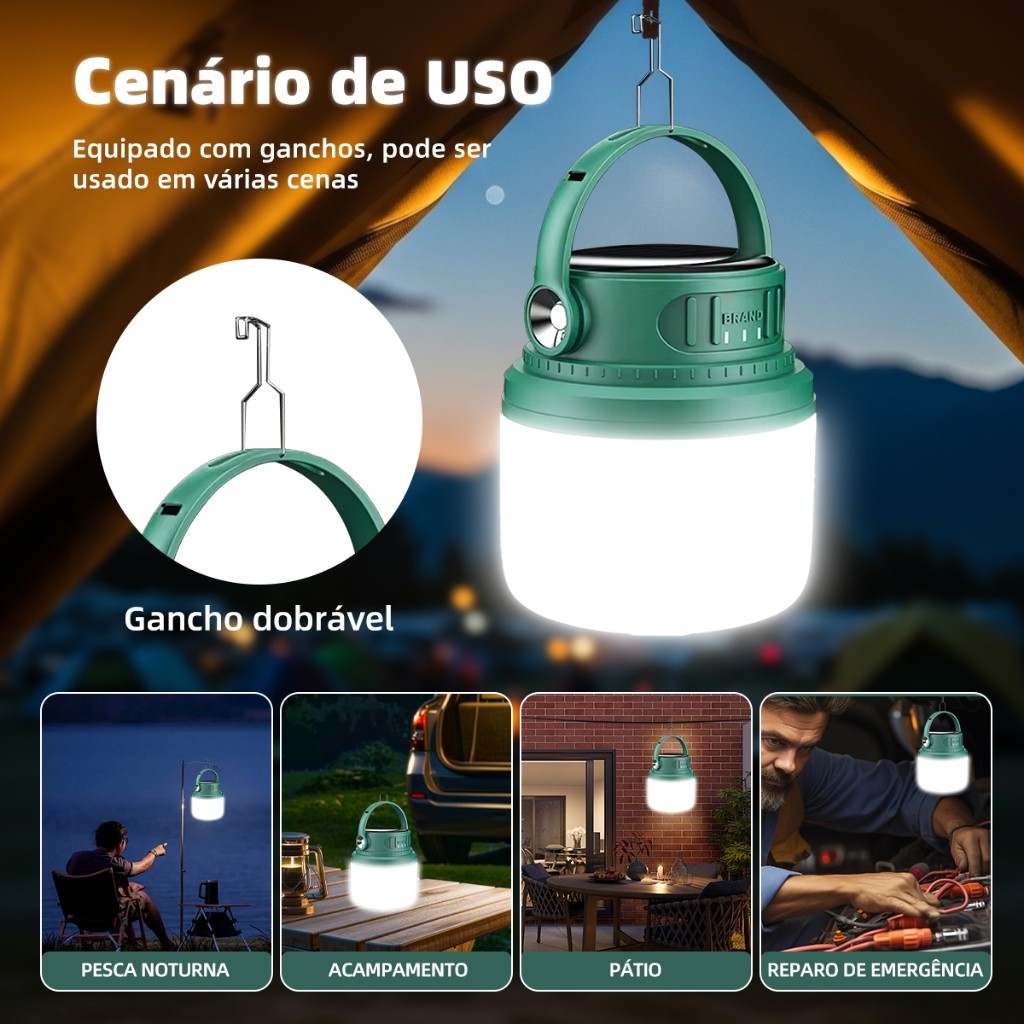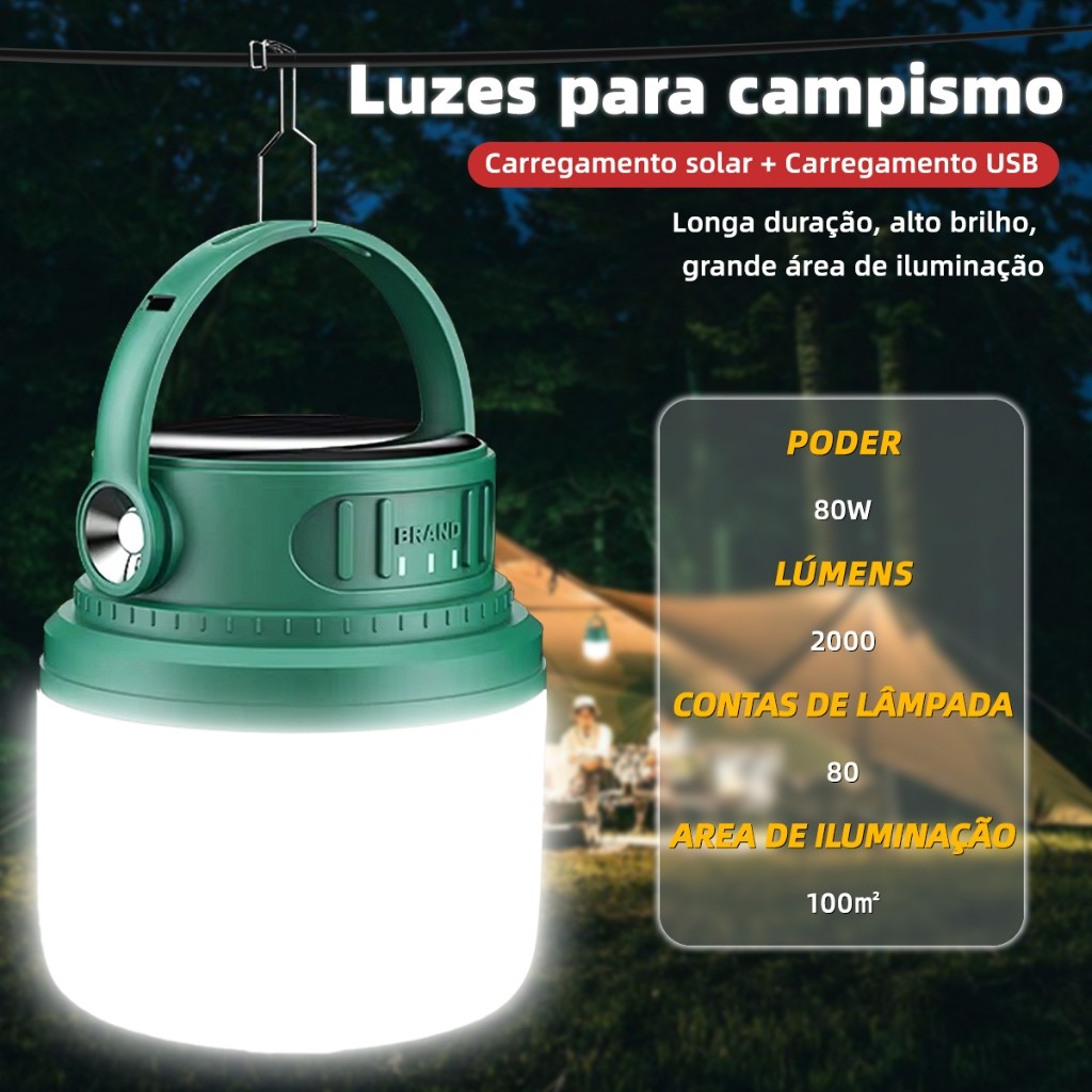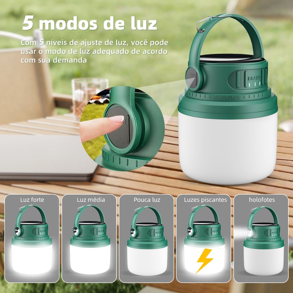 Luminária Solar/USB Recarregável 5 Modos - LED de Longa Duração para Acampamento e Pesca