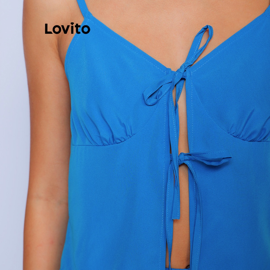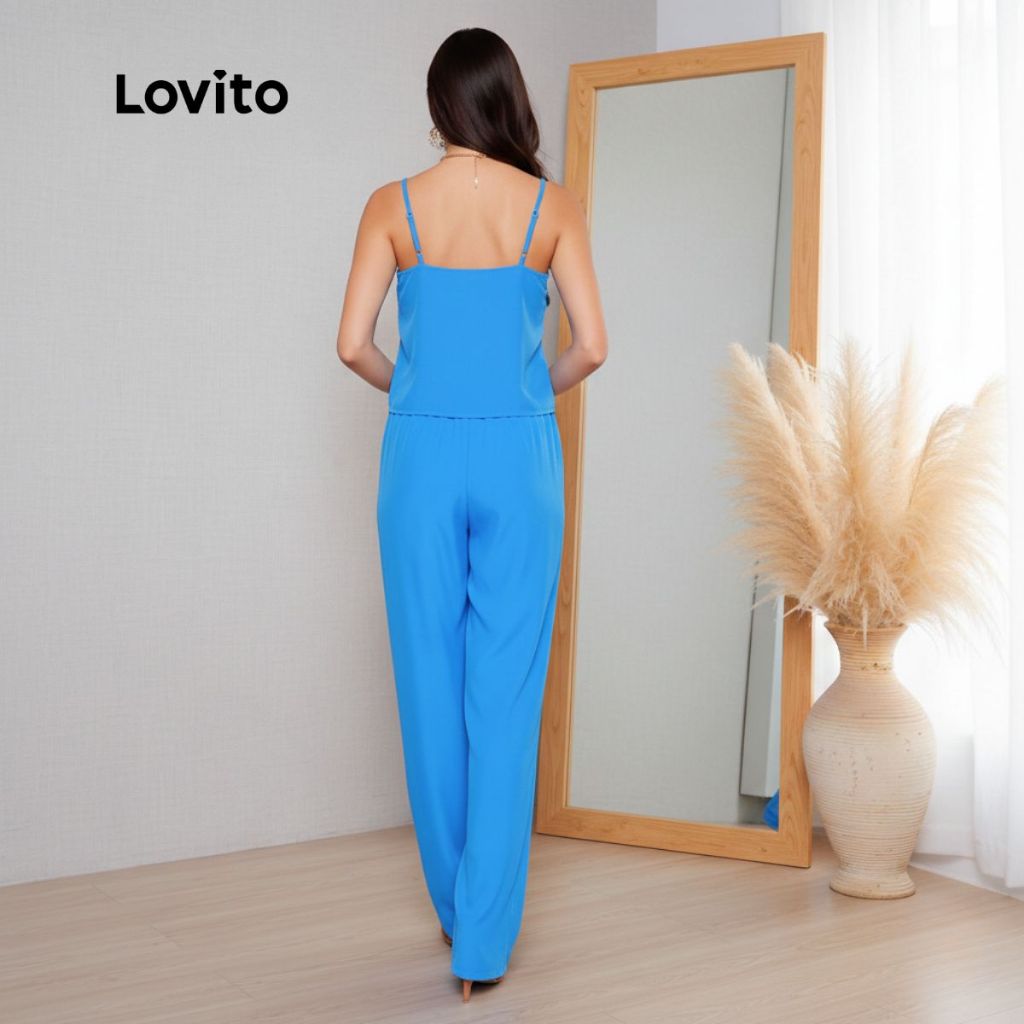 Lovito Conjunto Top e Calca Azul Moda Feminino Casual Liso com Amarração Frontal PSB544BRL574BL