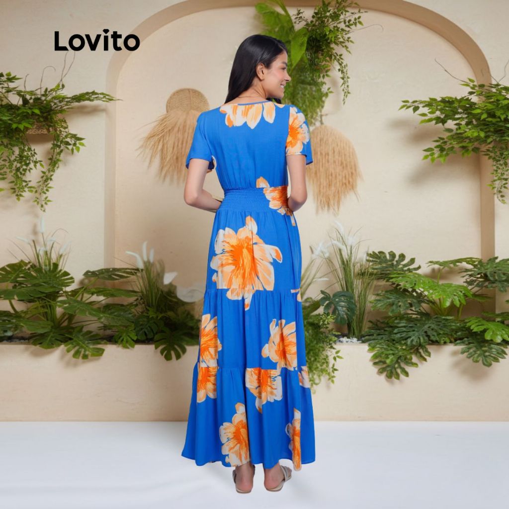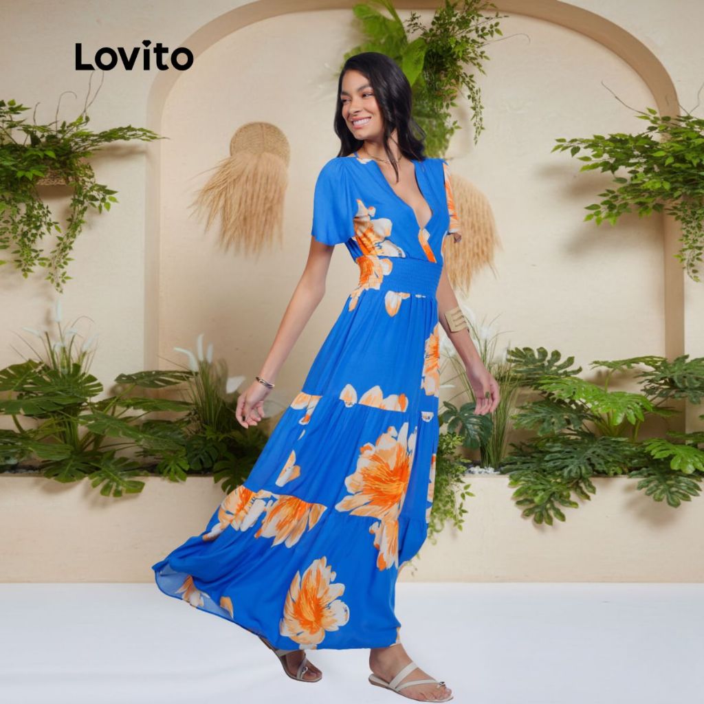 Lovito Bossa l Vestido Longo Viscose Com Decote V e Mangas Curta Estampa Flores DRB1062BRL1092