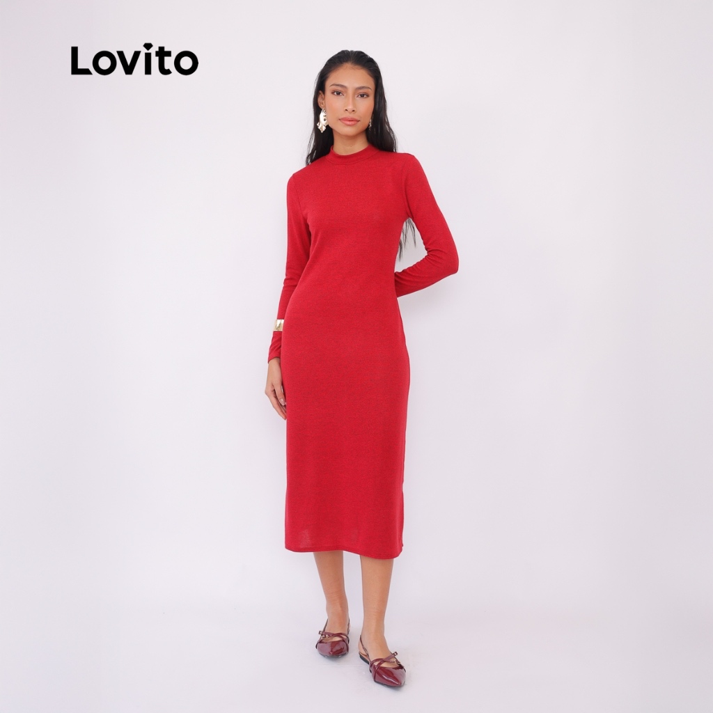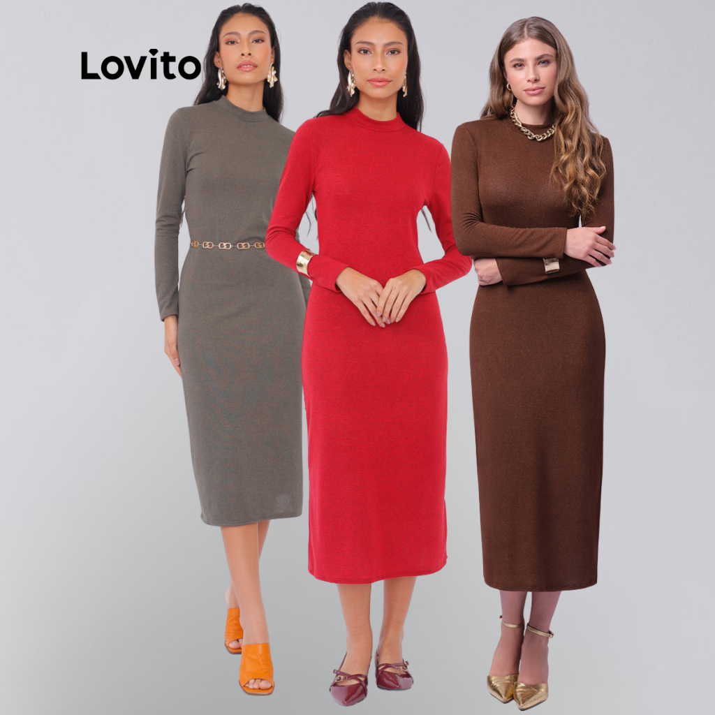 Lovito Vestido Midi Tricot Manga Longa Moda Basico Feminino DRB432BRL461