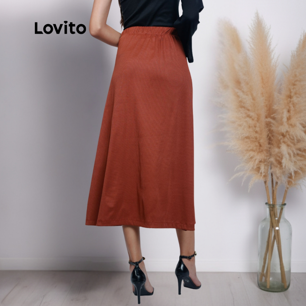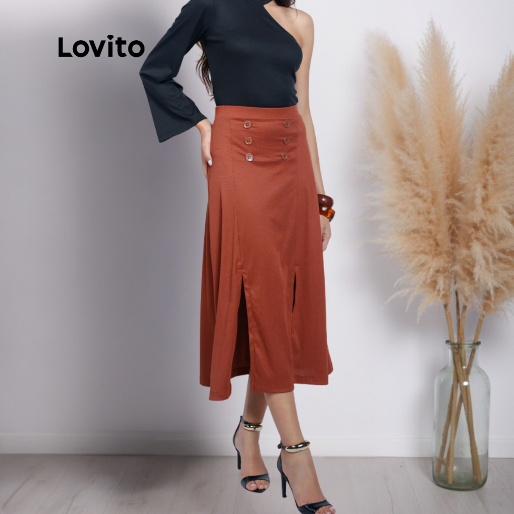 Lovito Saia Longa Botoes Rib Fenda Moda Elegante Marrom Feminina BRSKB1058BRL1088