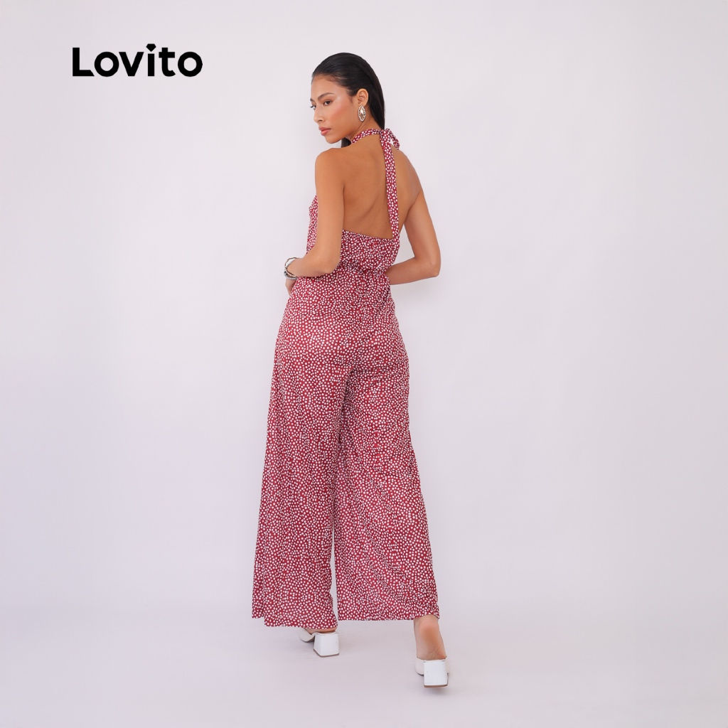 Lovito Macacão Longo Sem Mangas Alfaiataria Acinturado Moda Elegante Poá para Mulheres JRB873BRL903
