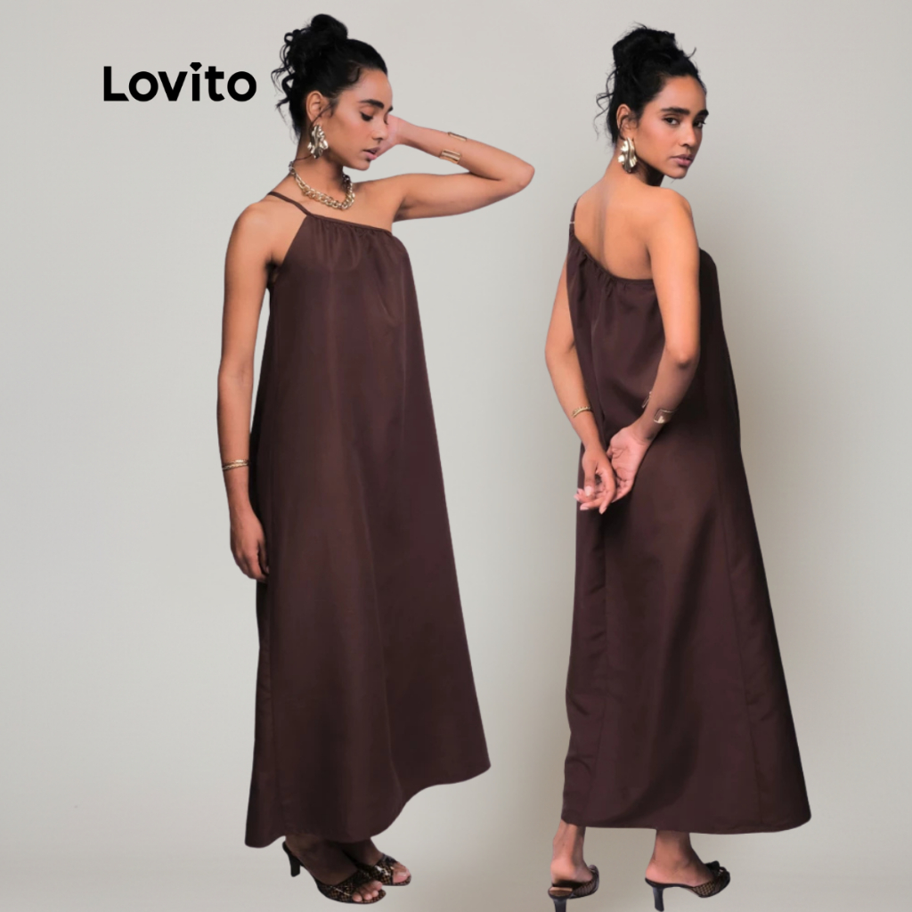 Lovito Vestido Um Ombro Só Longo Marrom Elegante Liso Feminino DRB605BRL635BR