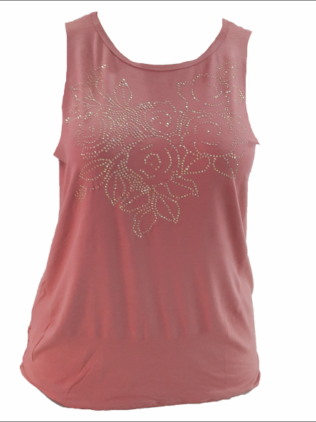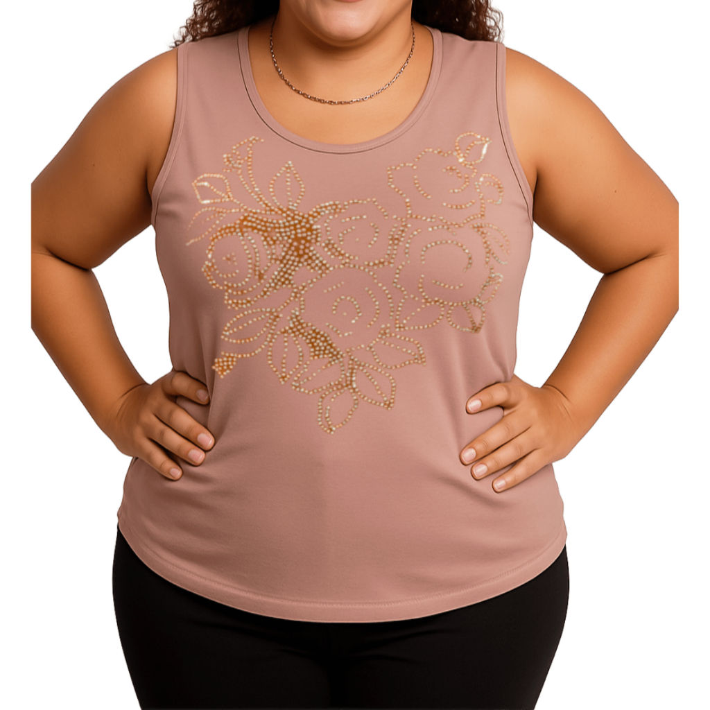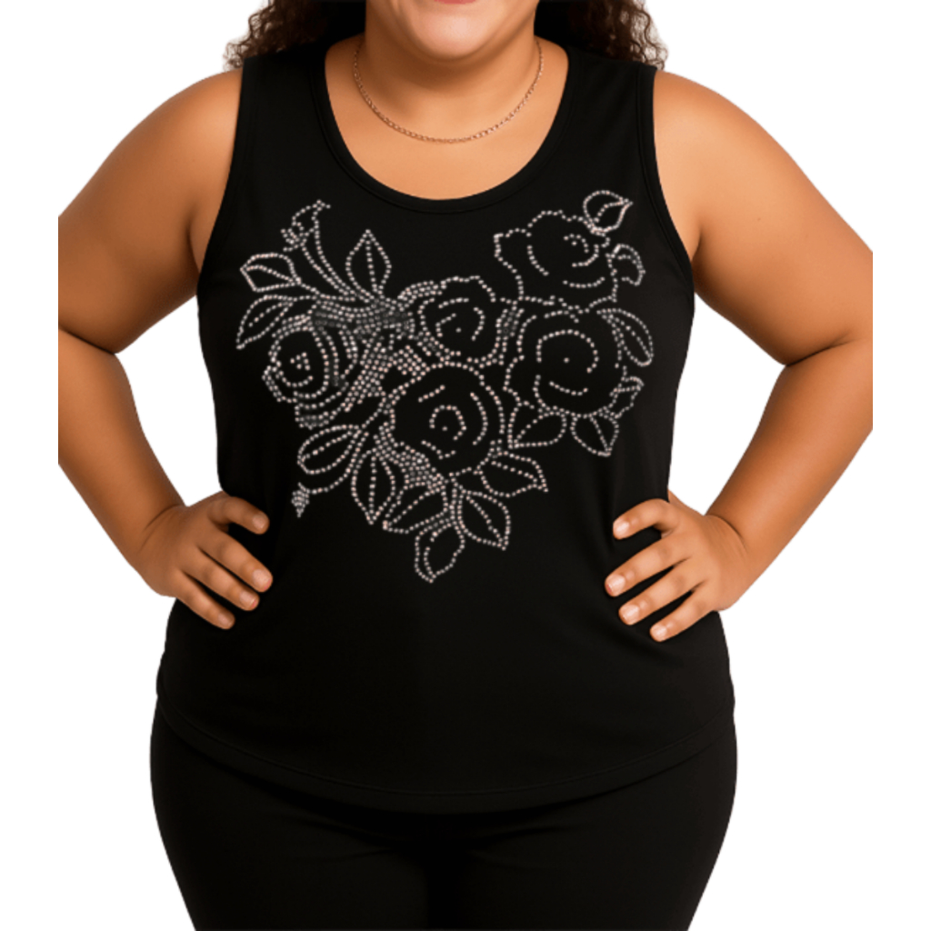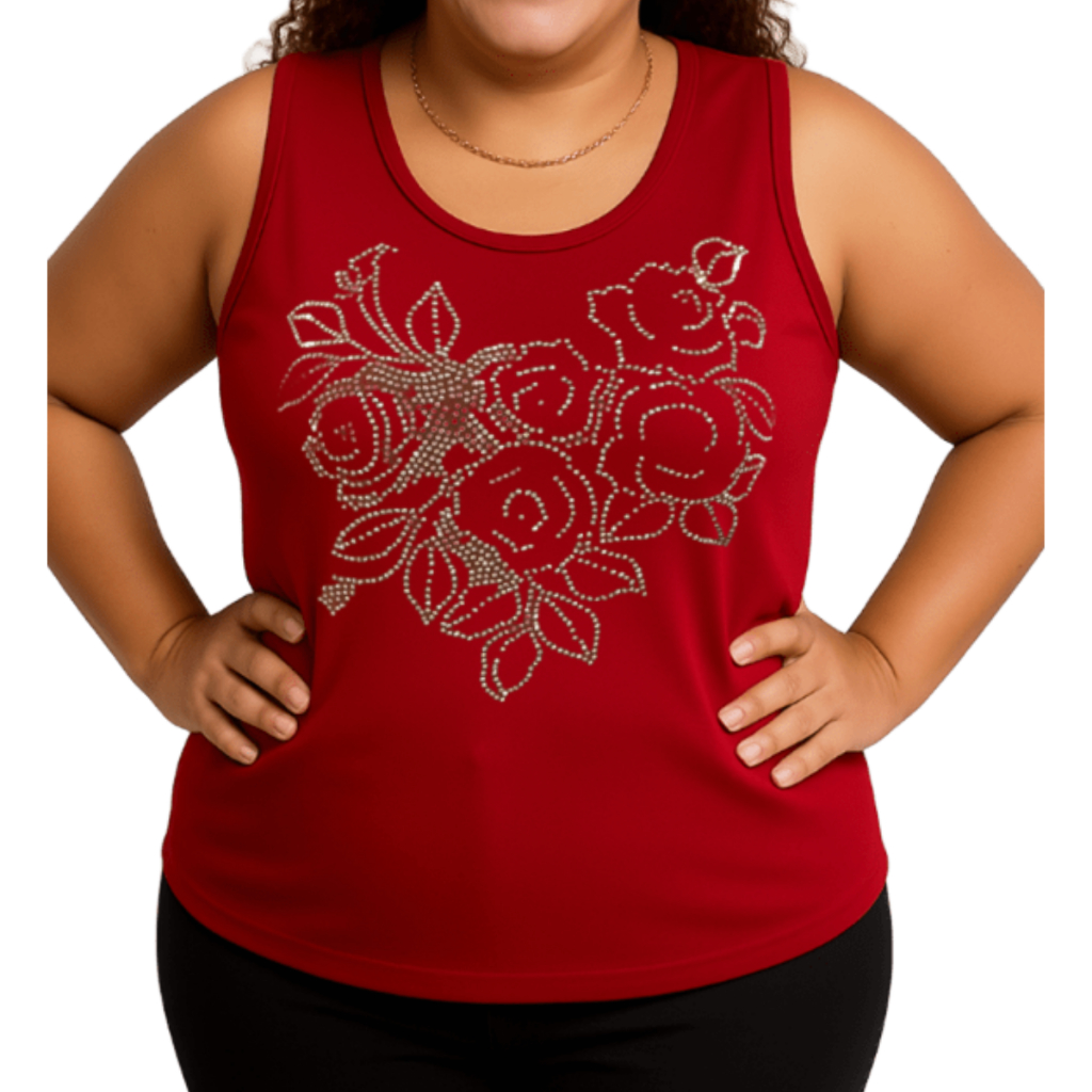 Regata Feminina Plus Size Pedraria Flores Tamanho M ao G10 (40 Ao 64) Blusa Regata Malha Viscolycra