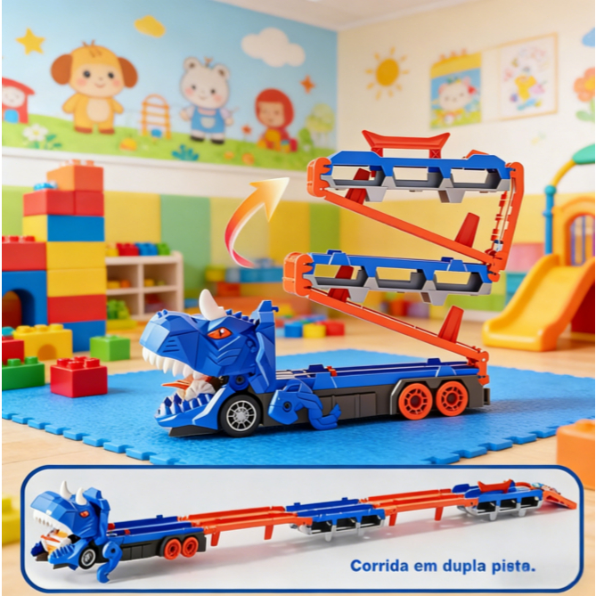 Caminhão Dinossauro 4 em 1 com pista e lancador, 6 carrinhos demetal