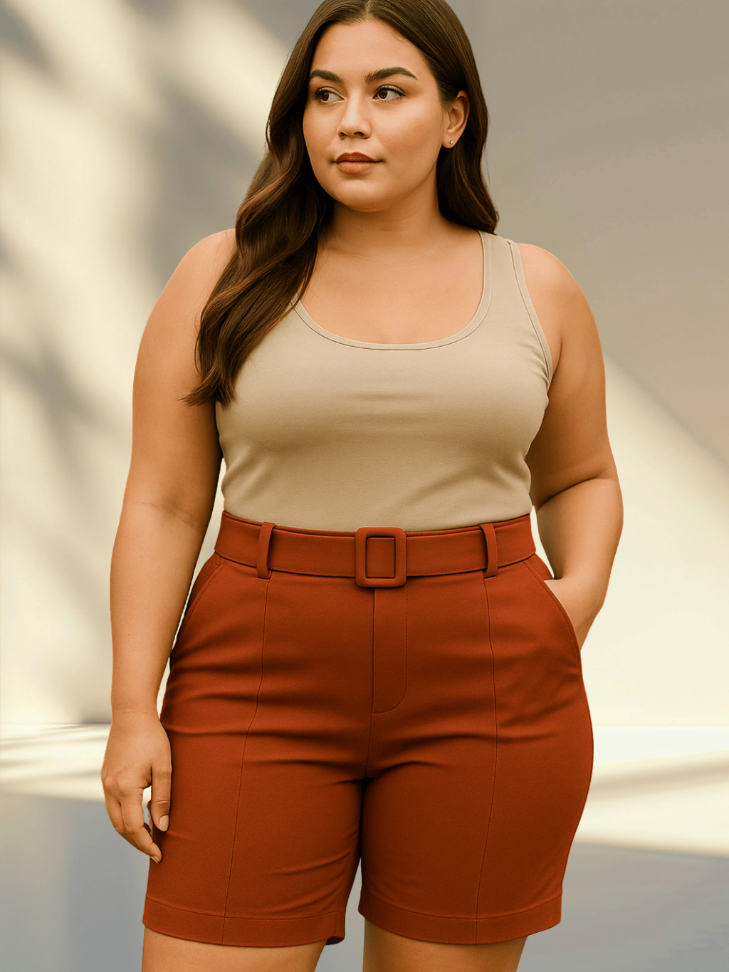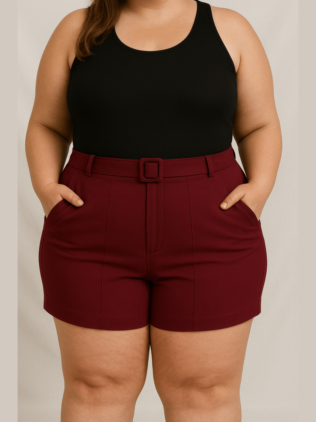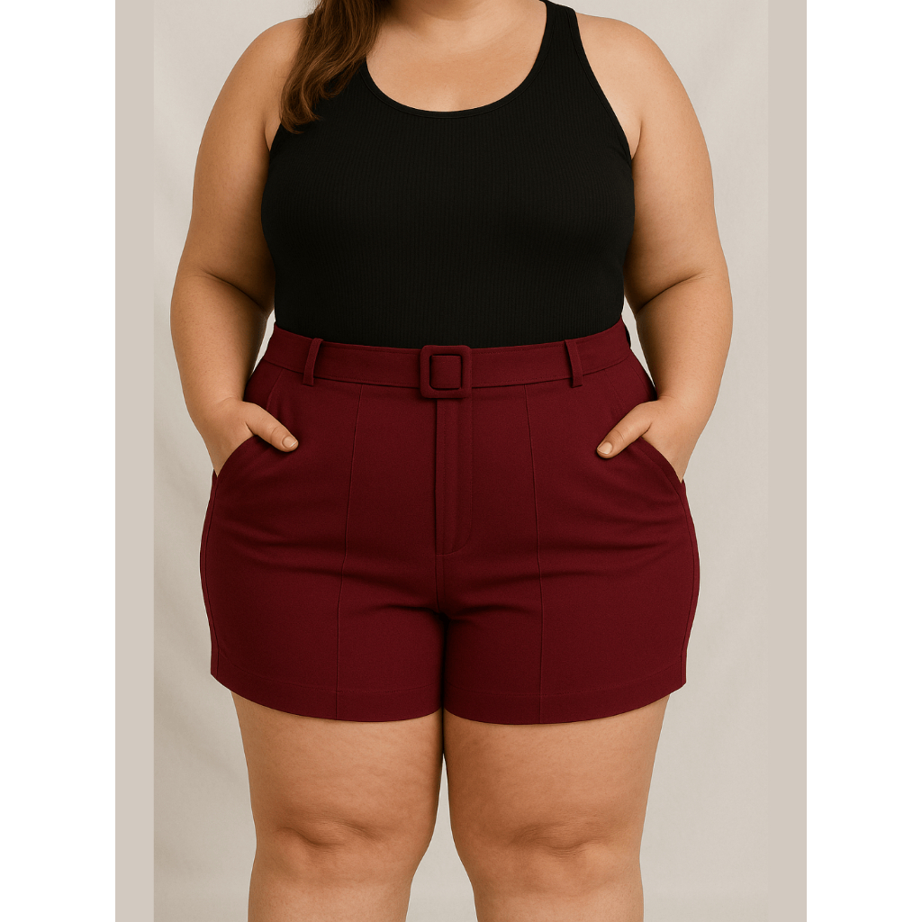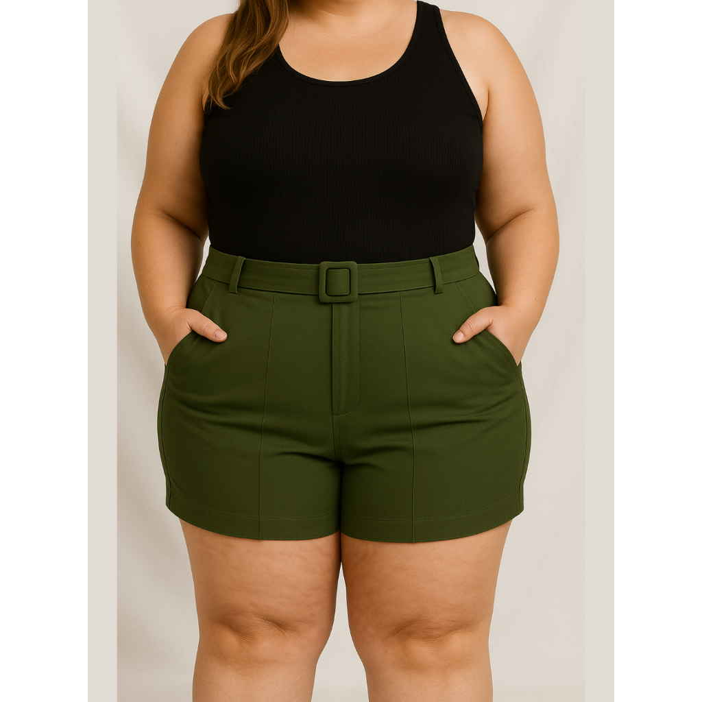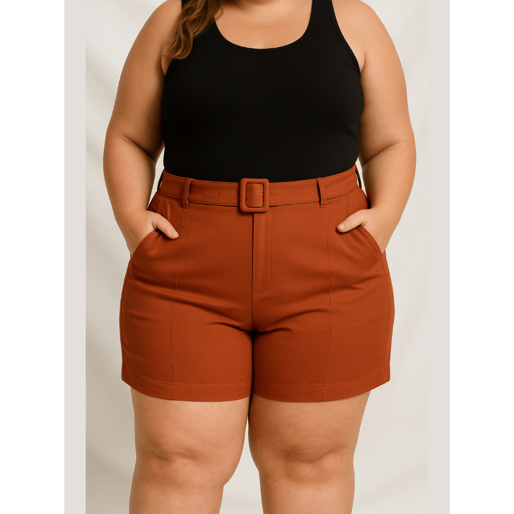 Shorts Bermuda Feminina Plus Size Social Com Cinto Fivela Tecido Bengaline Cintura Alta 42 ao 52