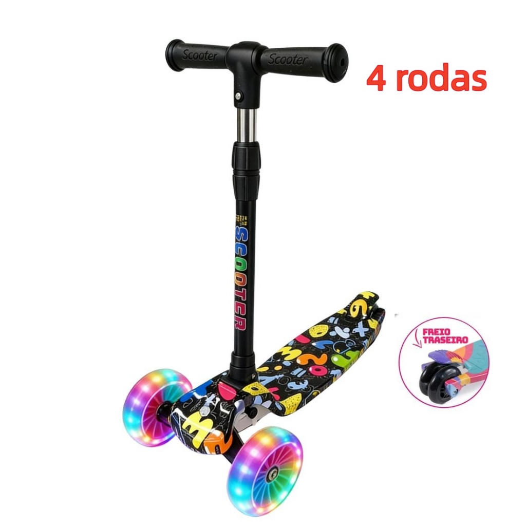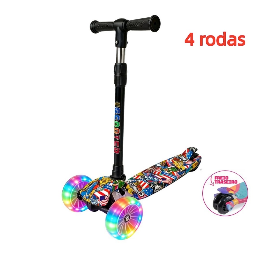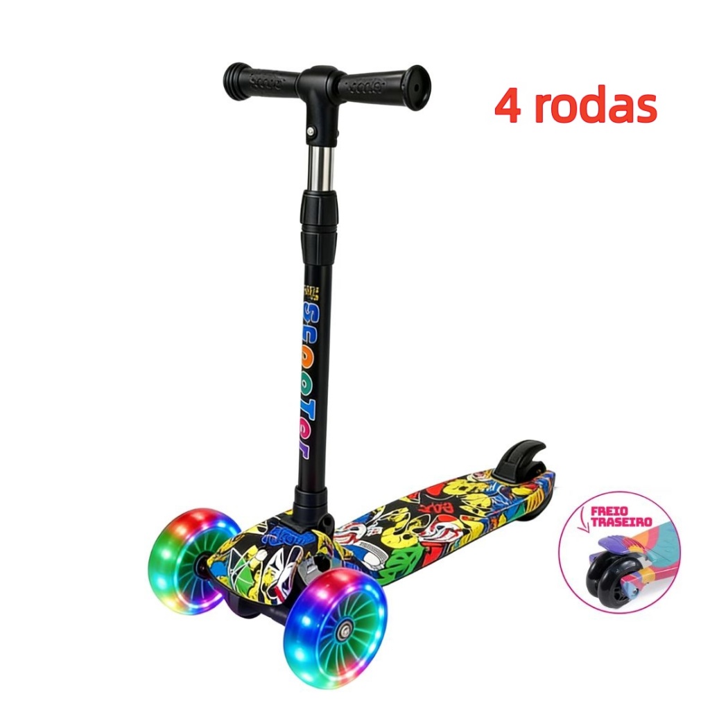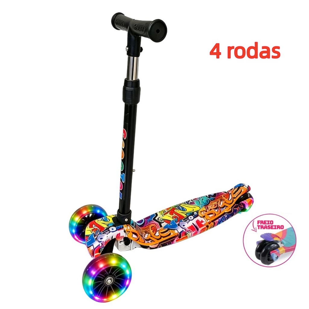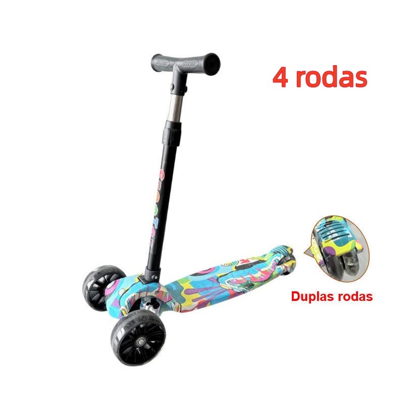 Patinete Infantil 3-5 Anos 4 Rodas LED Ajustável em Altura Estilo Graffiti para Menino e Menina