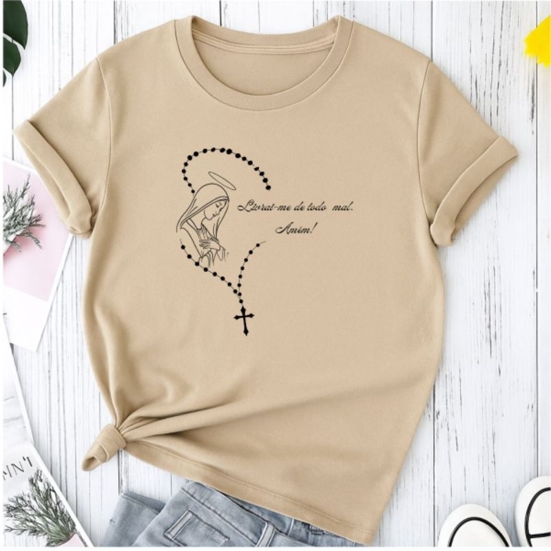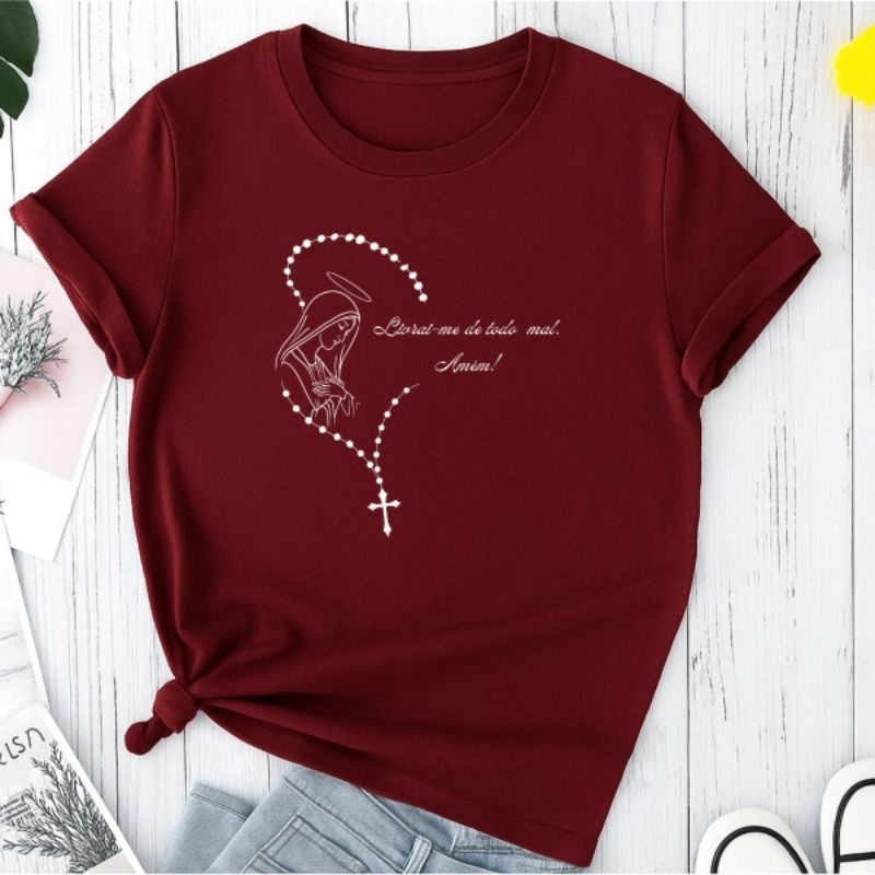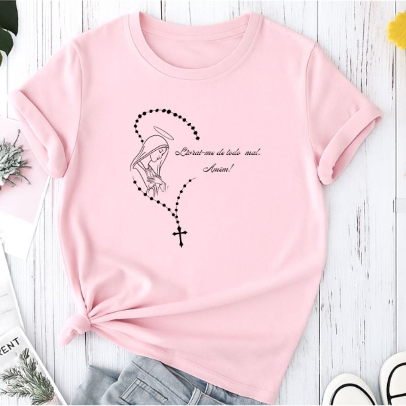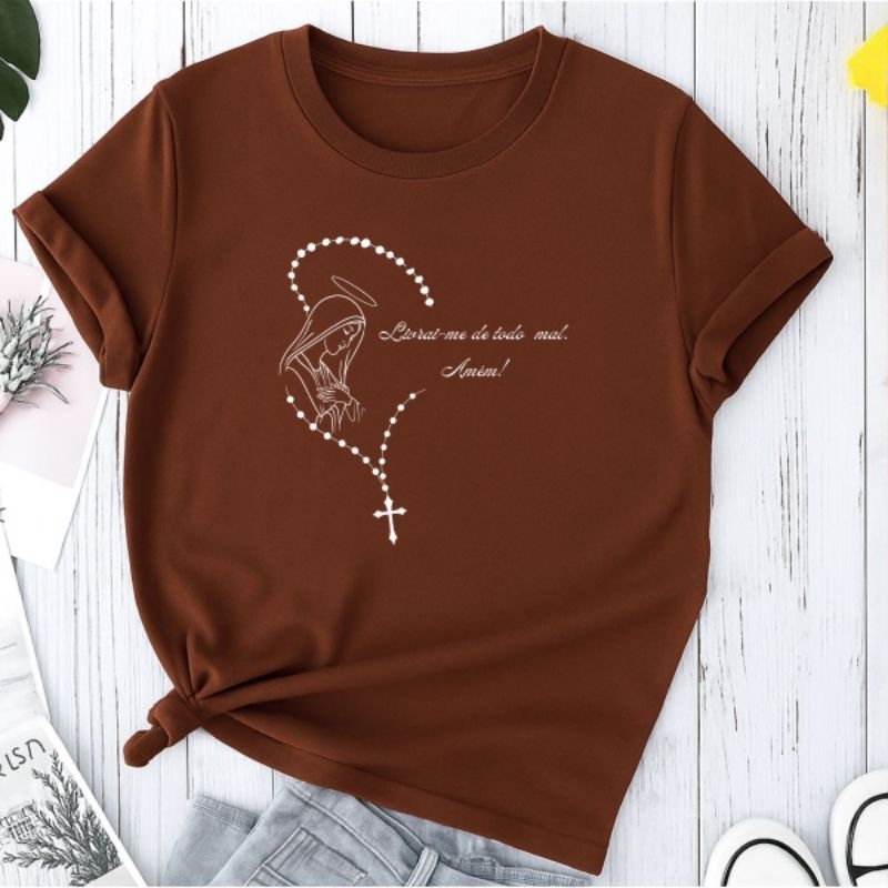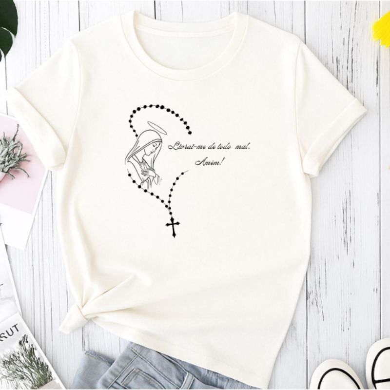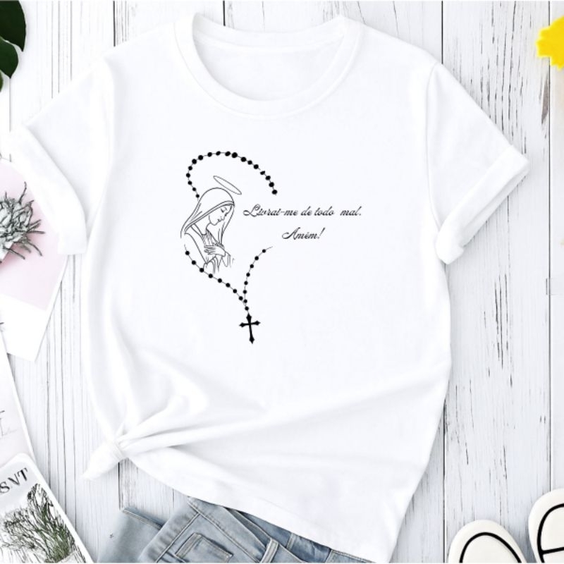 Camiseta T-shirt Camisa Feminina Terço Virgem Maria Católica Moda Religiosa Cristã 100% Algodão