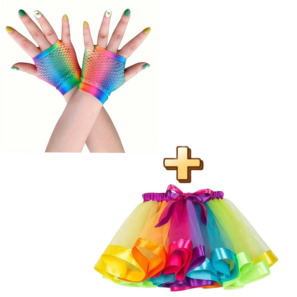 Kit Conjunto Luva/Meia/Saia Tule Arco-Íris Adulto-Tule Colorido 40cm para Festas e Carnaval