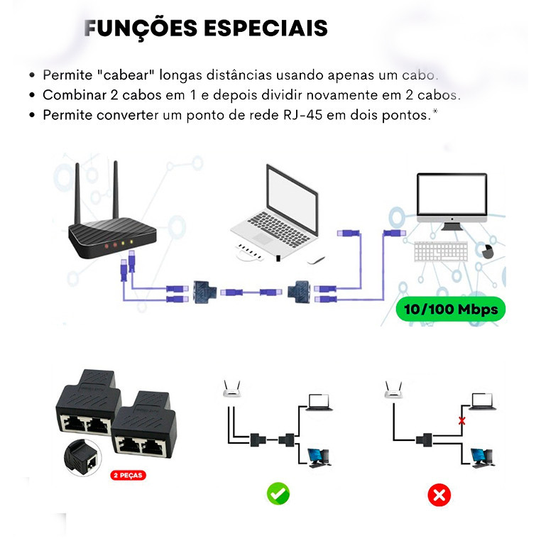 Adaptador distribuidor Cabo de Rede 1 a 2 vías Rj45 metal 1x2