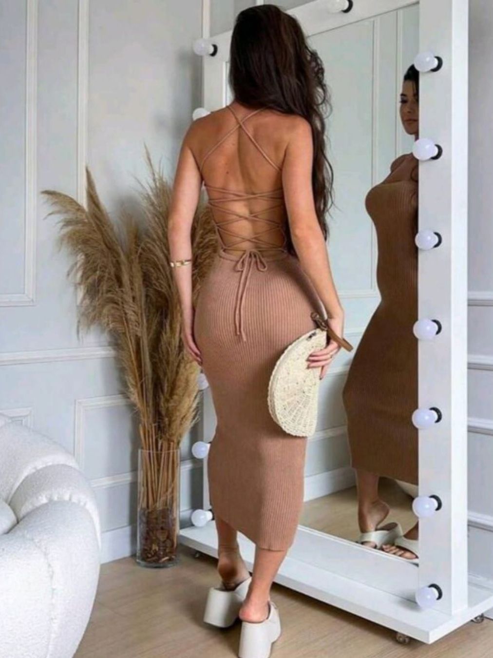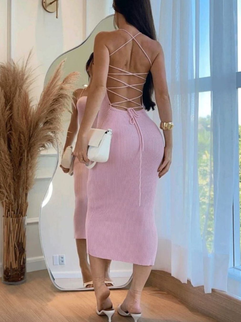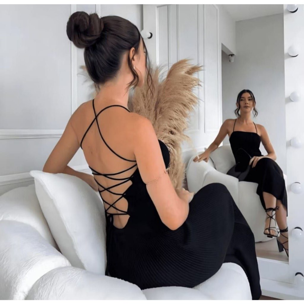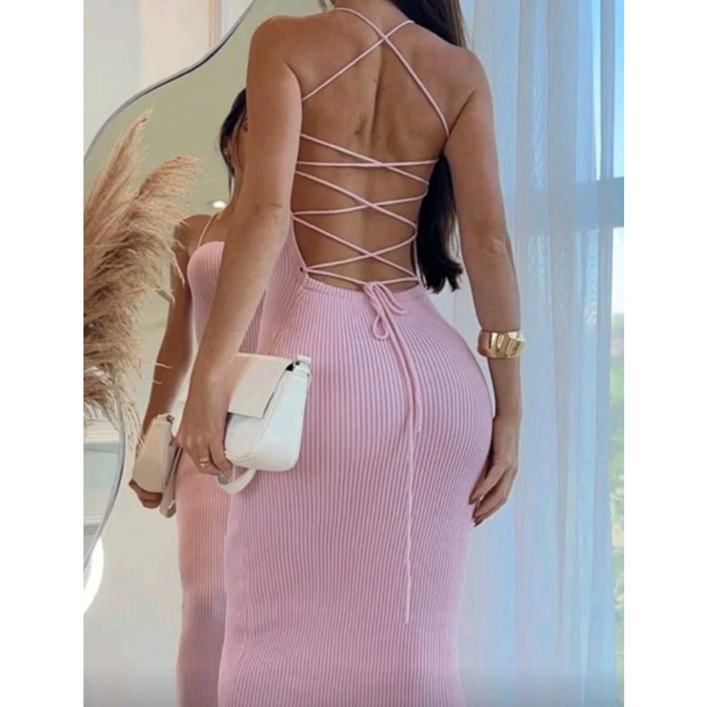 Vestido Modal Trico Liso Alça Fina Costas Amarração Cordão