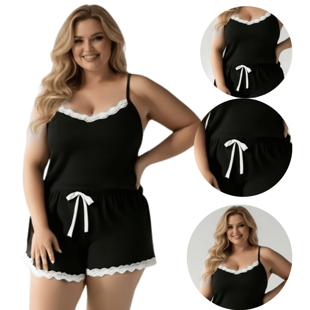 Pijama Único Feminino Plus Size Suede Canelado Sexy com Detalhe de Renda Premium
