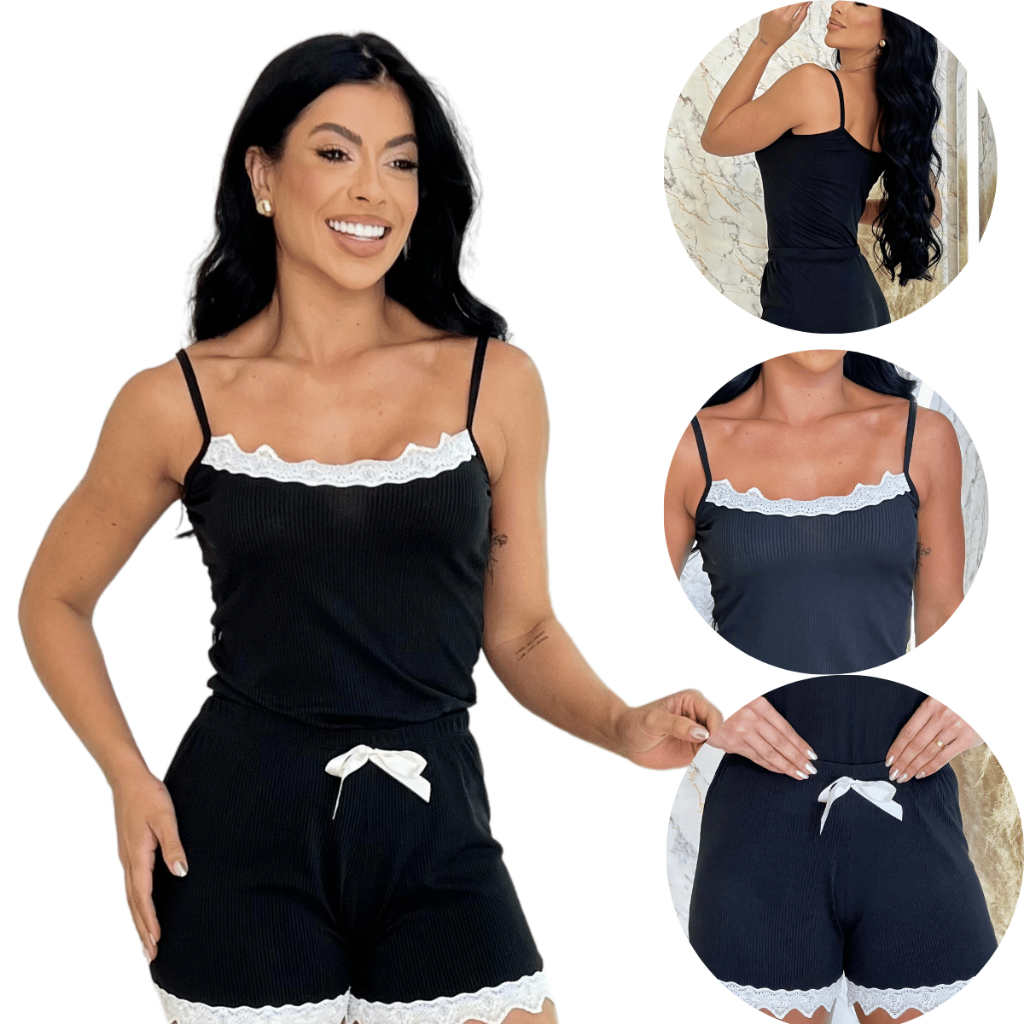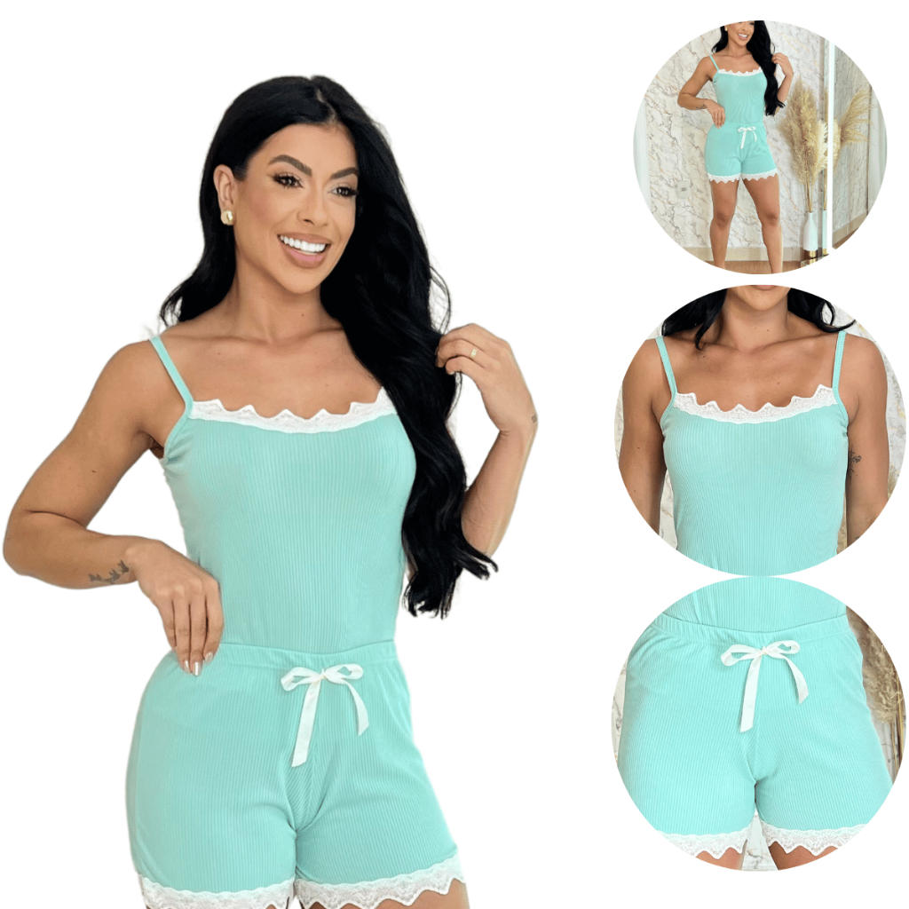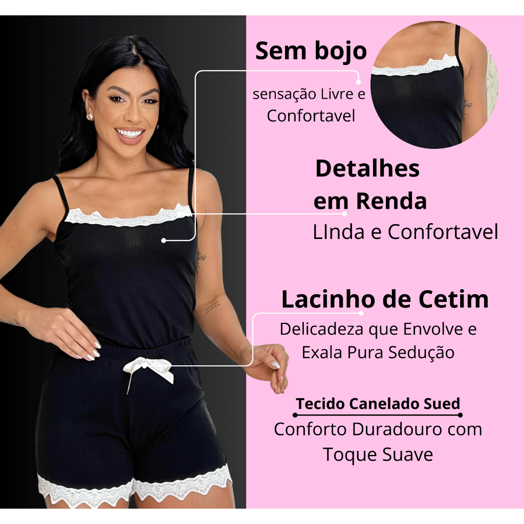 Kit 2 Pijamas Baby Doll Sexy Short Doll Canelado Feminino Detalhe de Renda Luxo Premium Sem Bojo