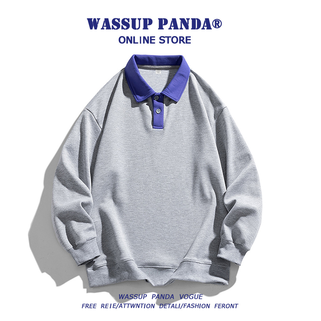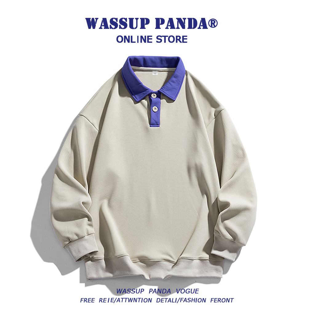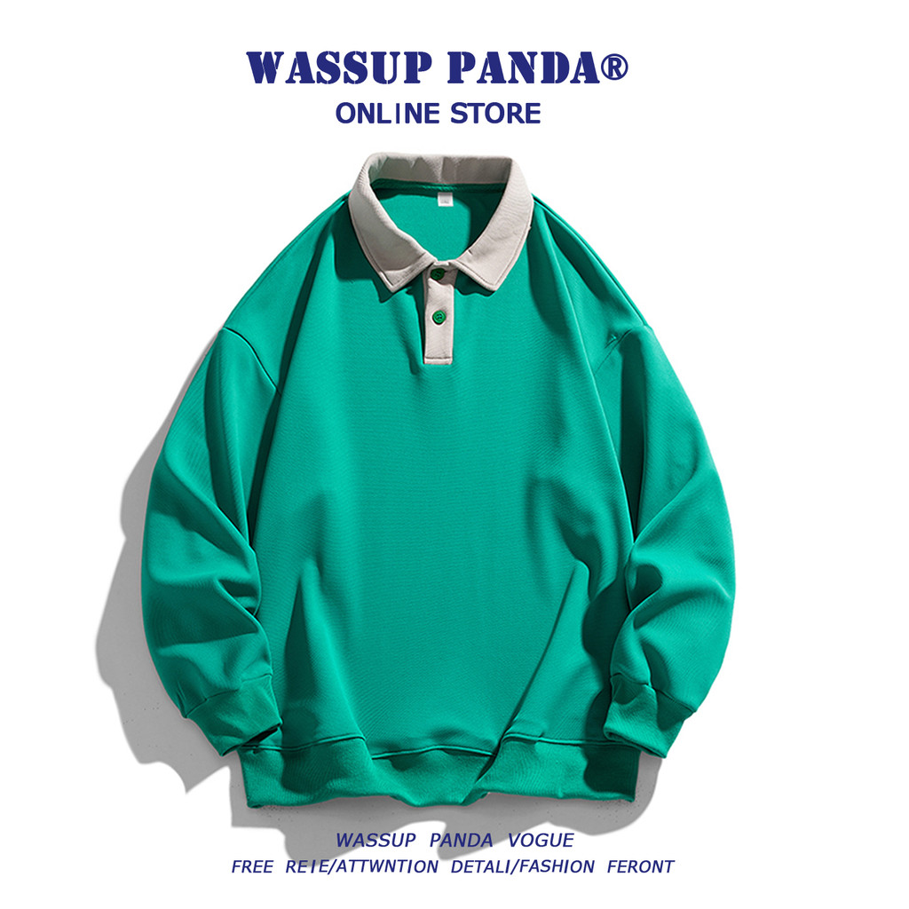 WASSUP PANDA Primavera Outono Retro Simples Camisa POLO de Manga Comprida Moletom Masculino Solto Casual All-Match Camis