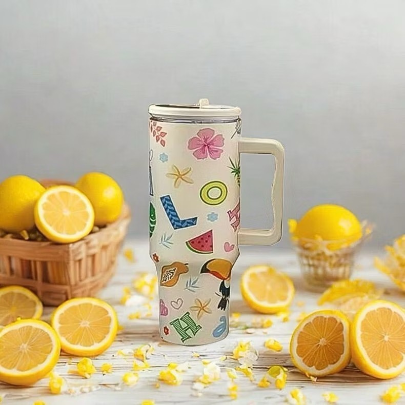COPO TERMICO DE 1200ML COM ALÇA E CANUDO ESTAMPADO BIRDS PASSAROS TUCANO ARARAS FAM FAUNA//Bico de canudo oculto