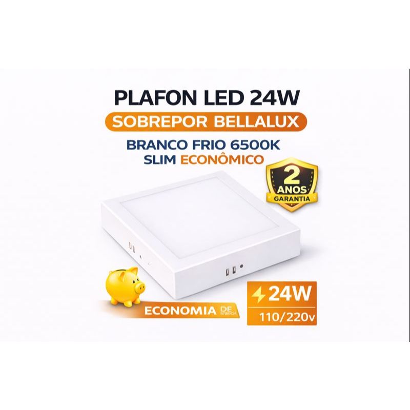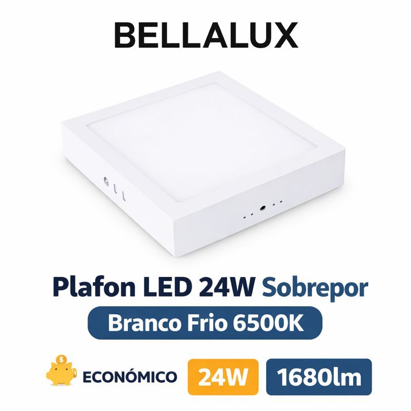 Plafon LED 24W Sobrepor Bellalux Quadrado Branco Frio 6500K Slim Econômico luminaria BIVOLT