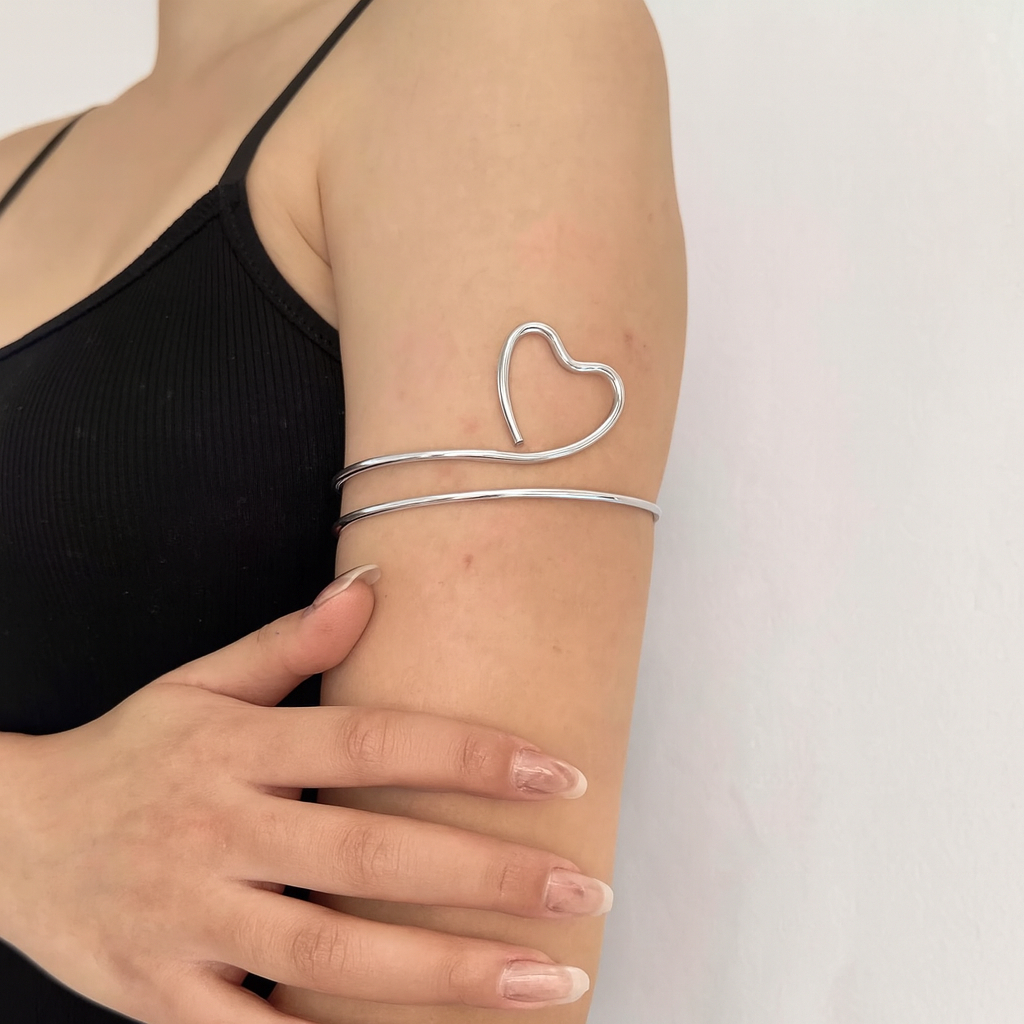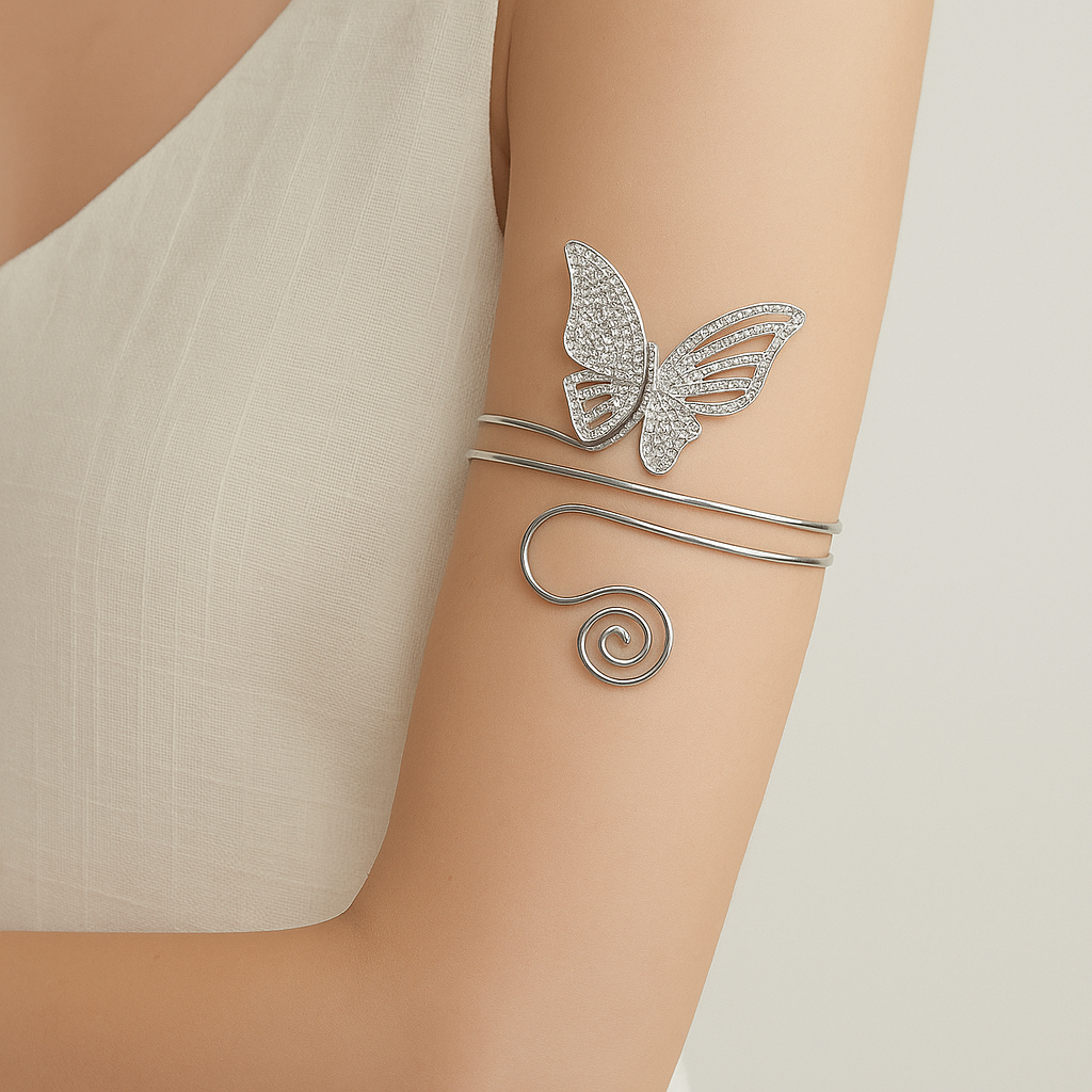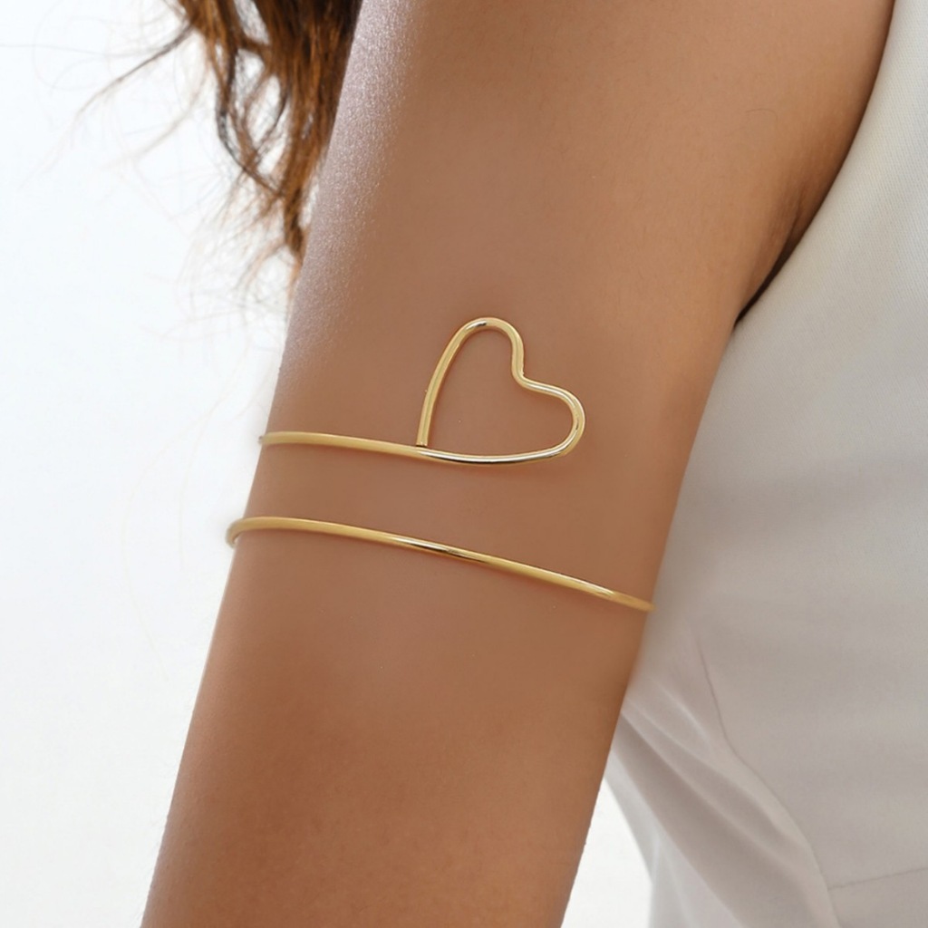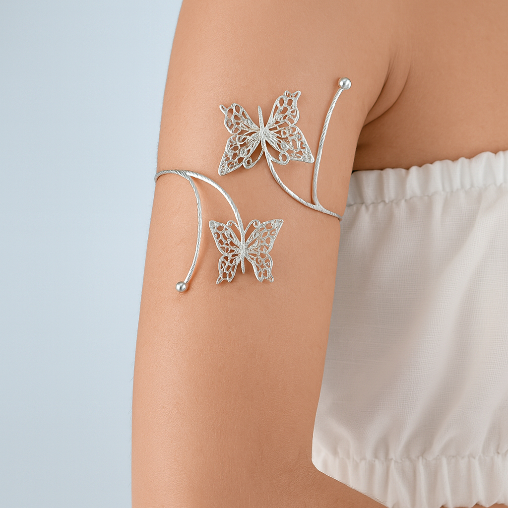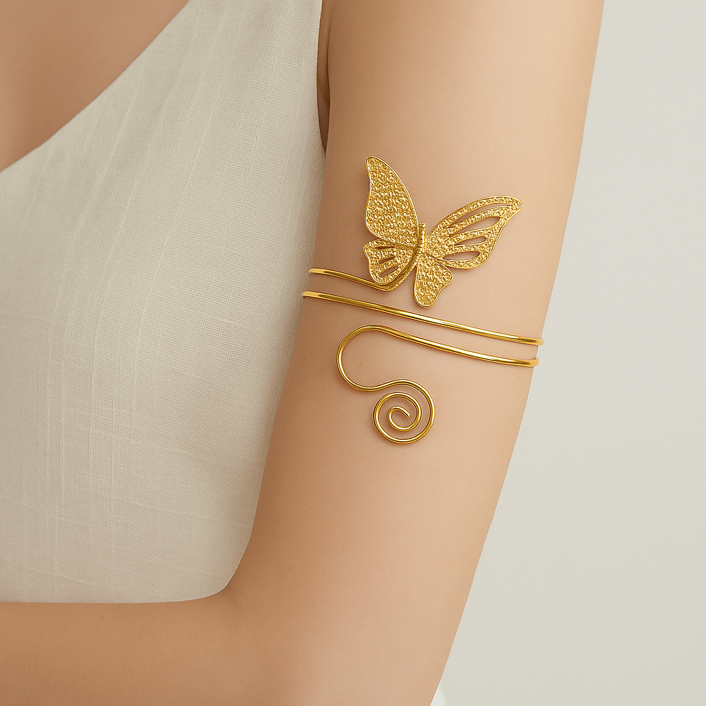 Pulseira de Braço Feminina Ajustável Geométrica com Coração, Folha e Borboleta Banhada a Ouro 18K e Prata 925