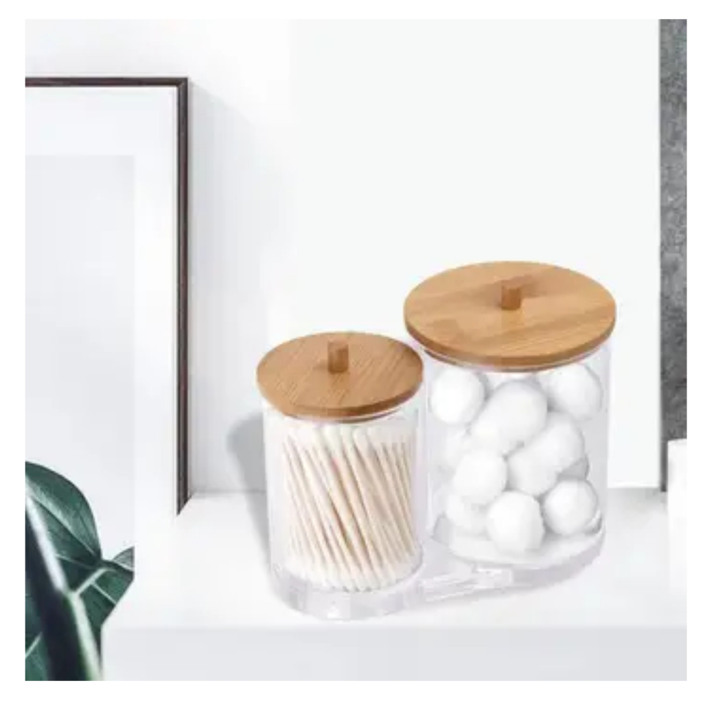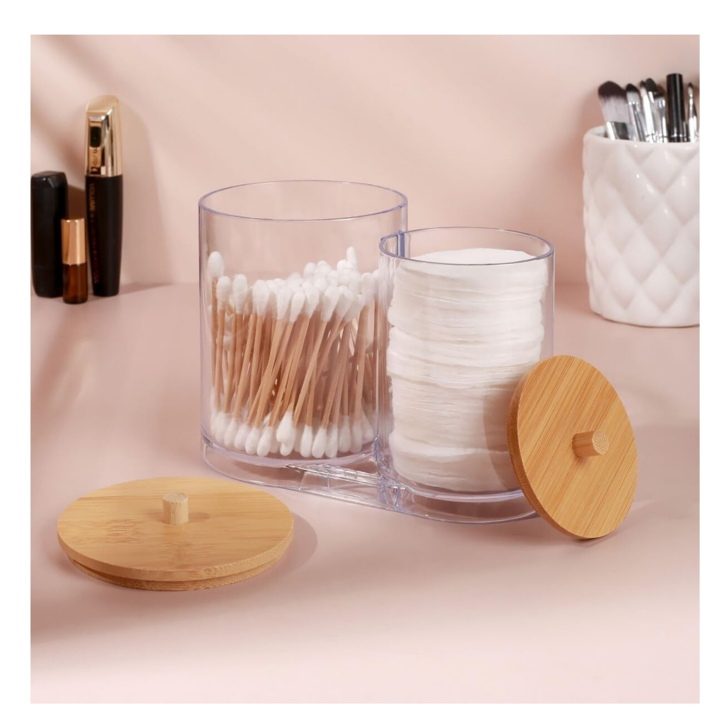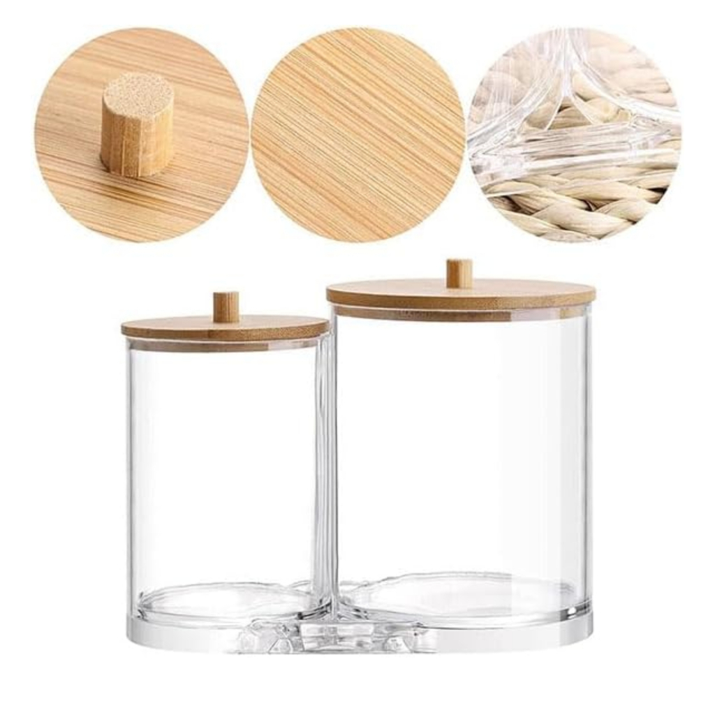 Porta Algodão e Cotonete Duplo Organizador Acrílico com Tampa de Bambu para Discos e Maquiagem