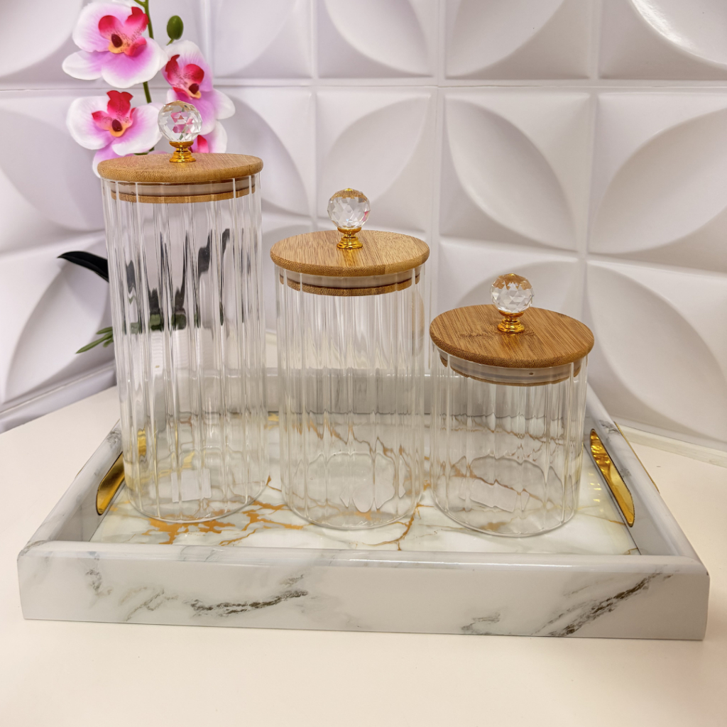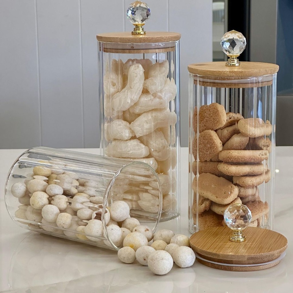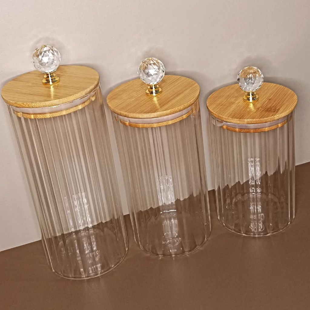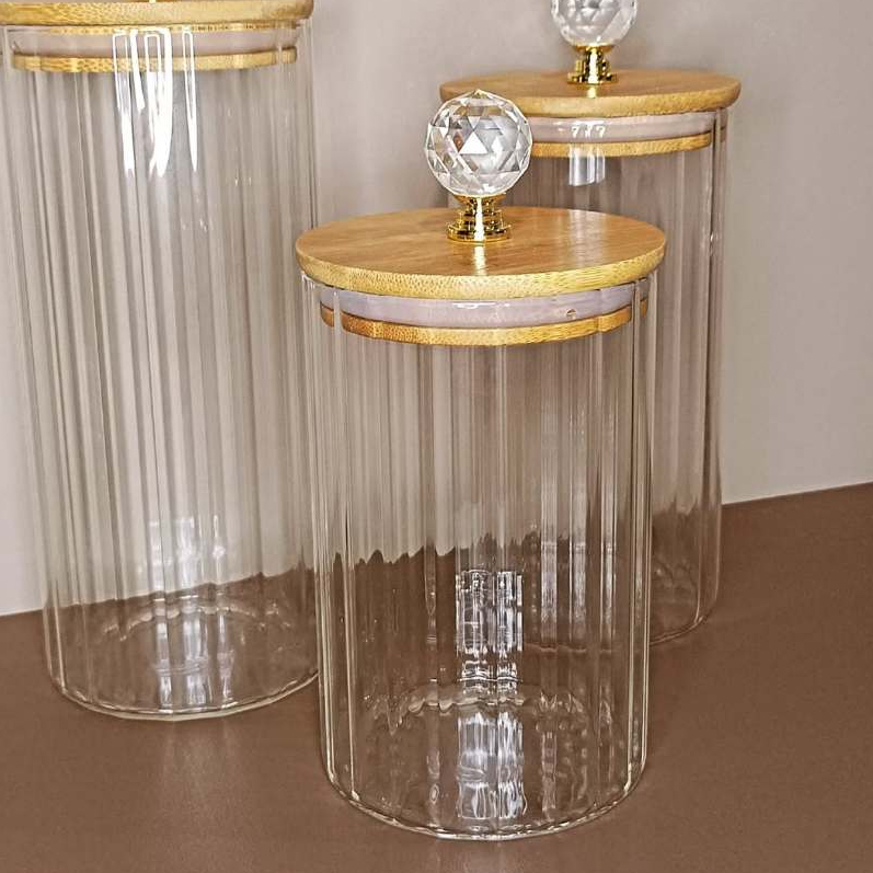 Kit de Potes Herméticos Vidro Canelado Transparente Cristal Luxo Tampa Bambu Cristal Luxo Porta Mantimentos