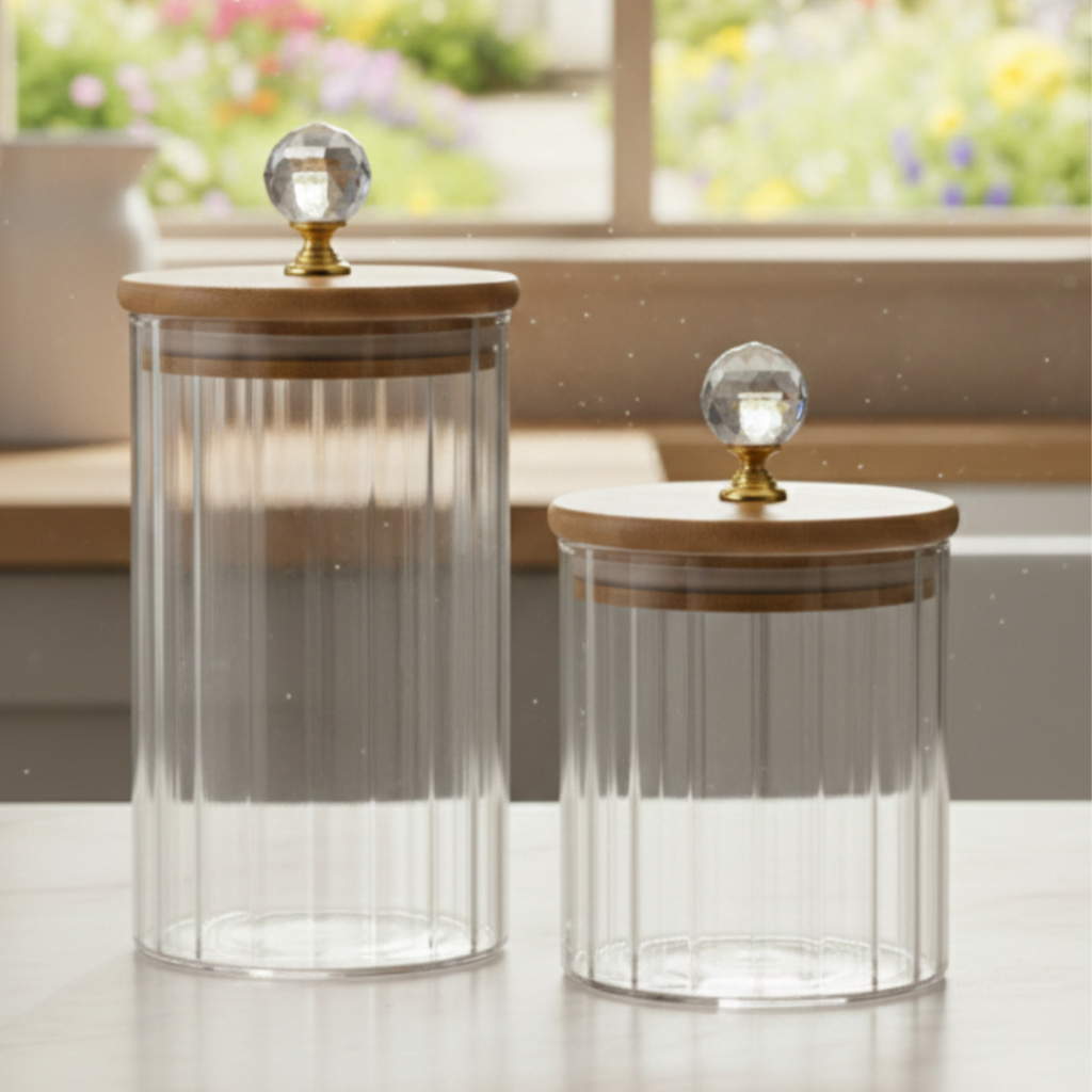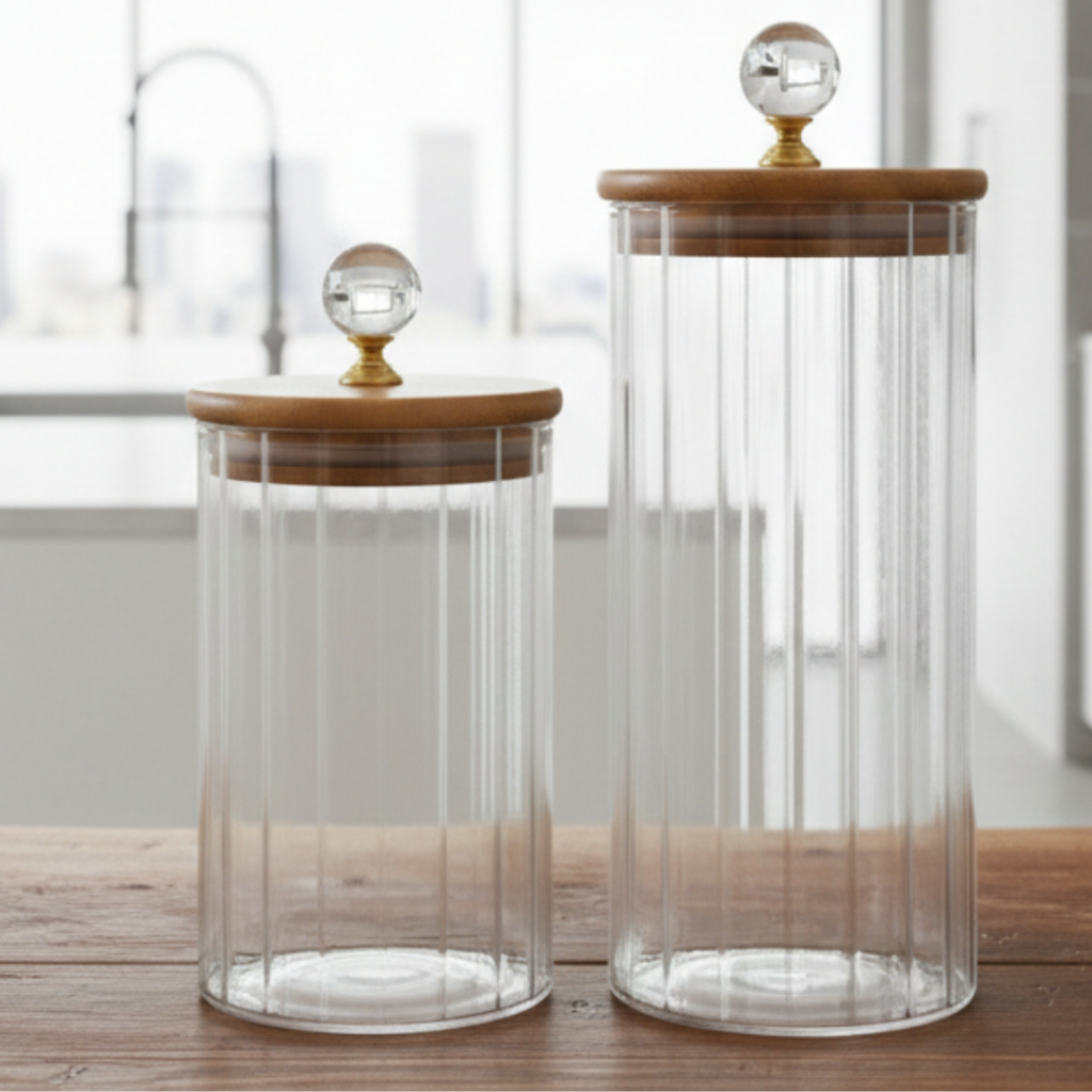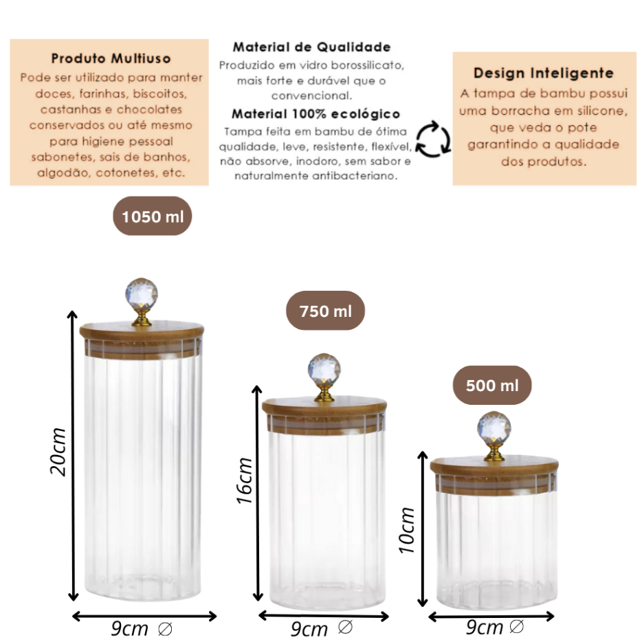 Kit de Potes Herméticos Vidro Canelado Transparente Cristal Luxo Tampa Bambu Cristal Luxo Porta Mantimentos