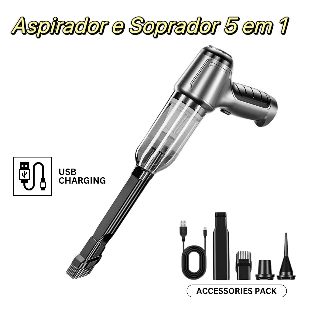 Aspirador e Soprador Portátil 5 em 1 - Alta Potência e Multifuncional para Limpeza Completa