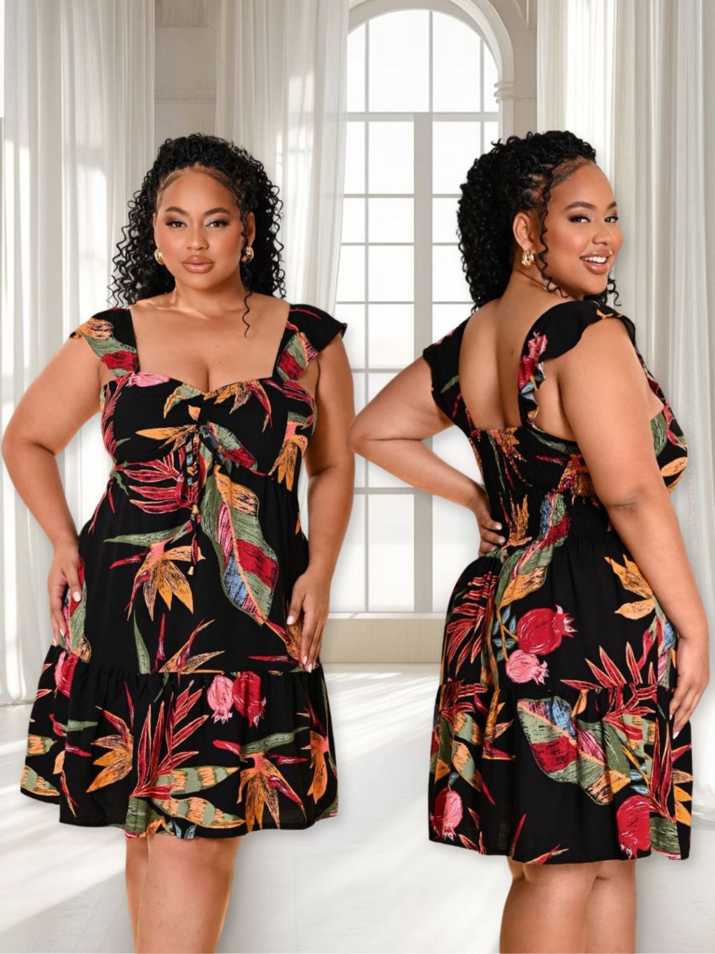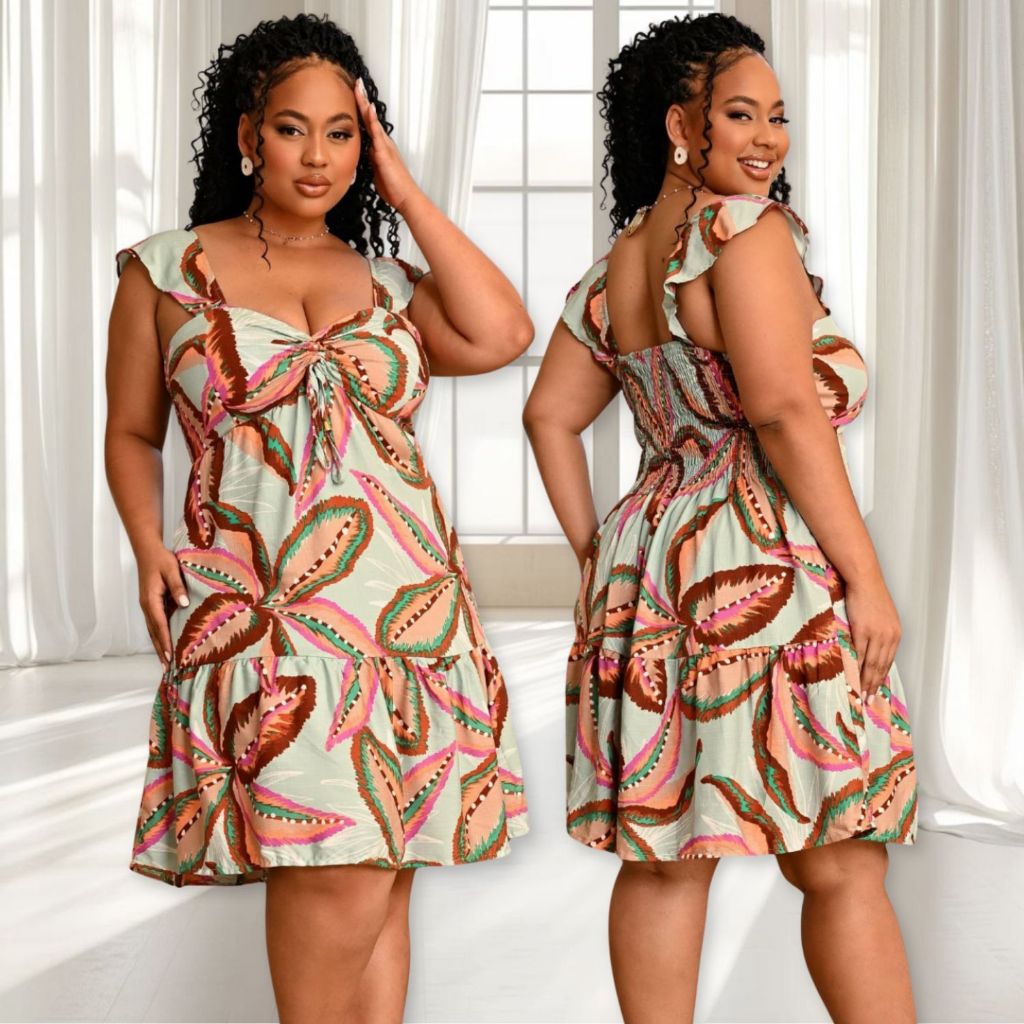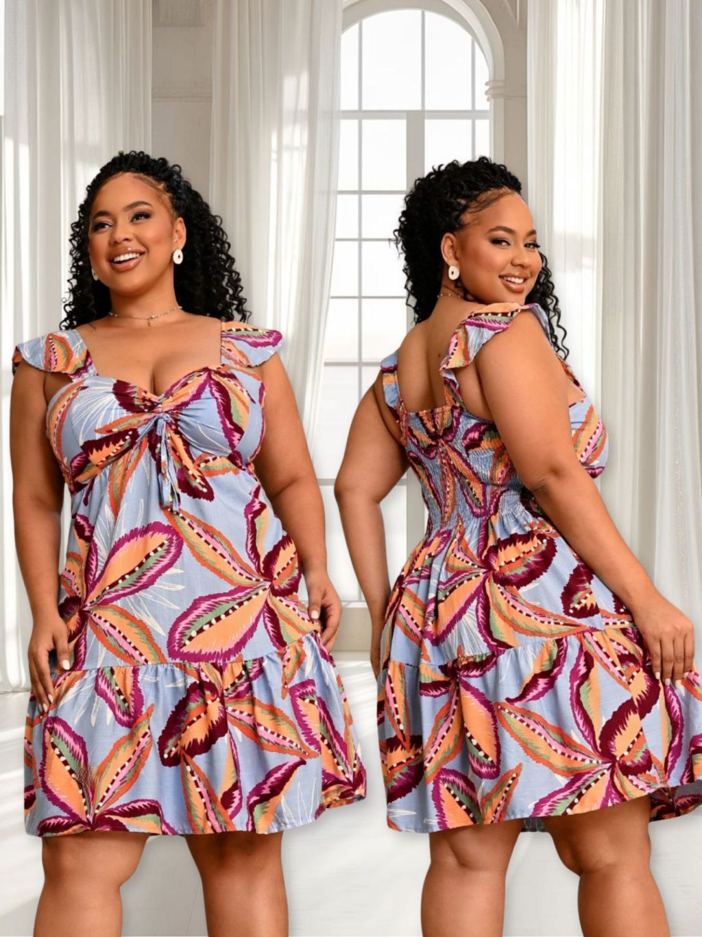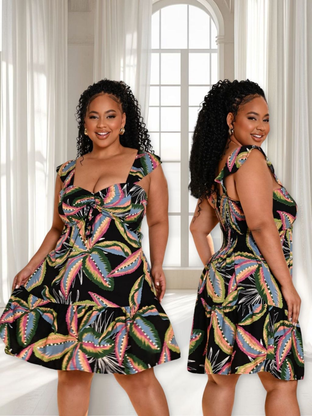 Vestido Plus Size Curto com Manga Babado e Lastex nas Costas Caimento Perfeito para o Dia a Dia