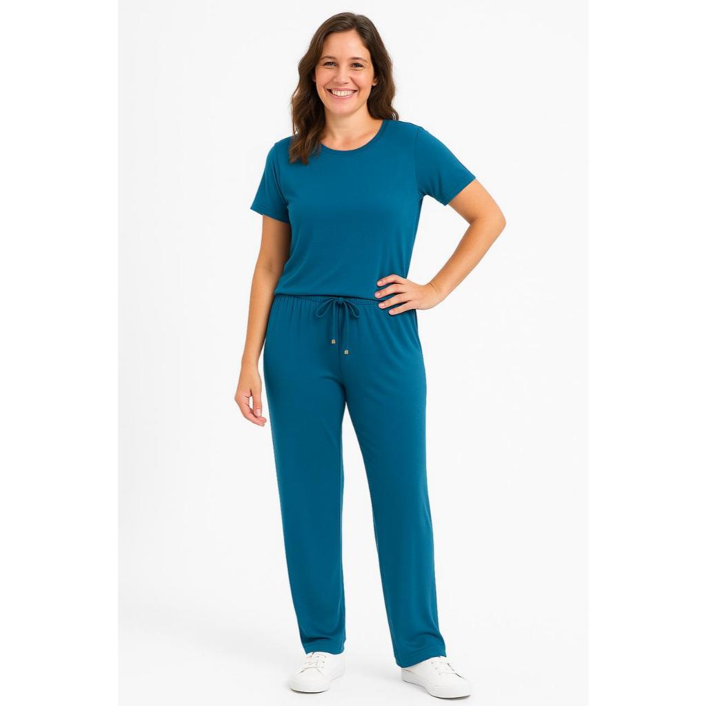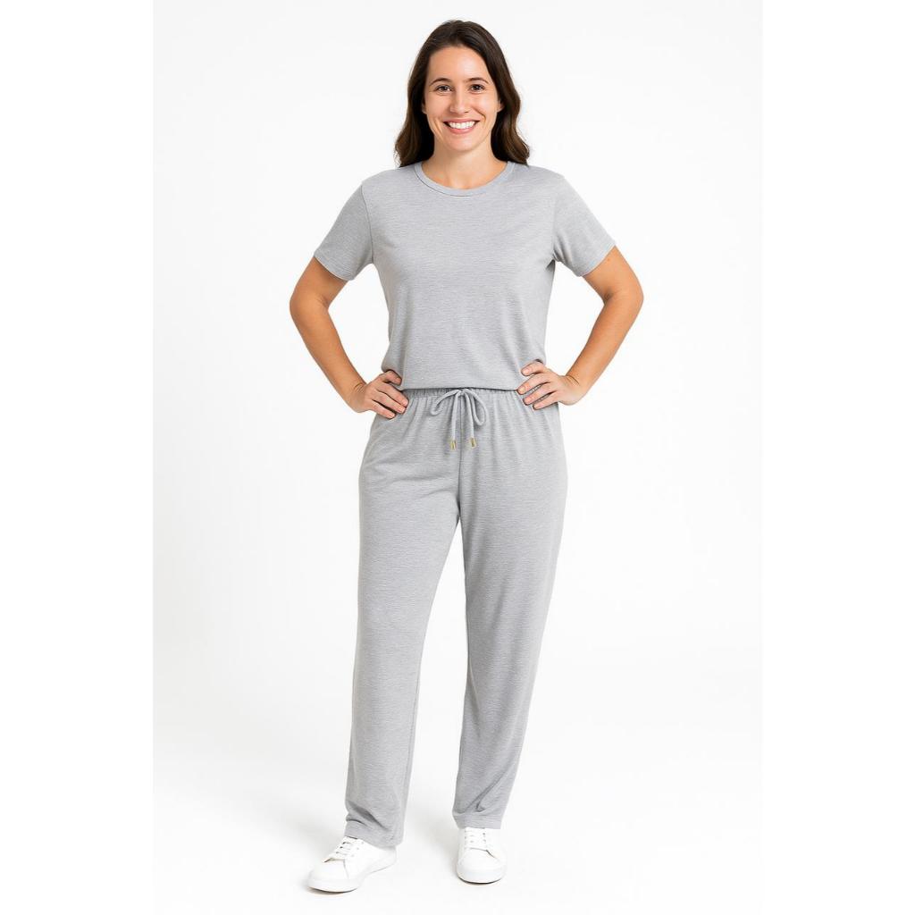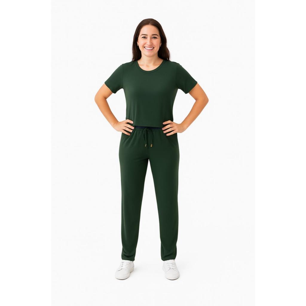 CONJUNTO VISCOLYCRA Feminino Malha Comfy Blusa Camiseta Manga Curta e Calça Cintura Alta Pantalona