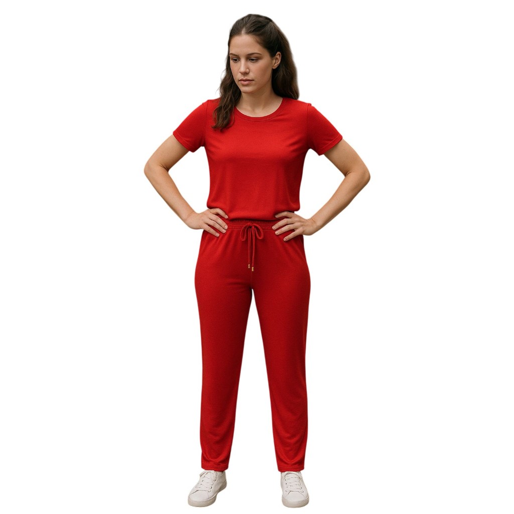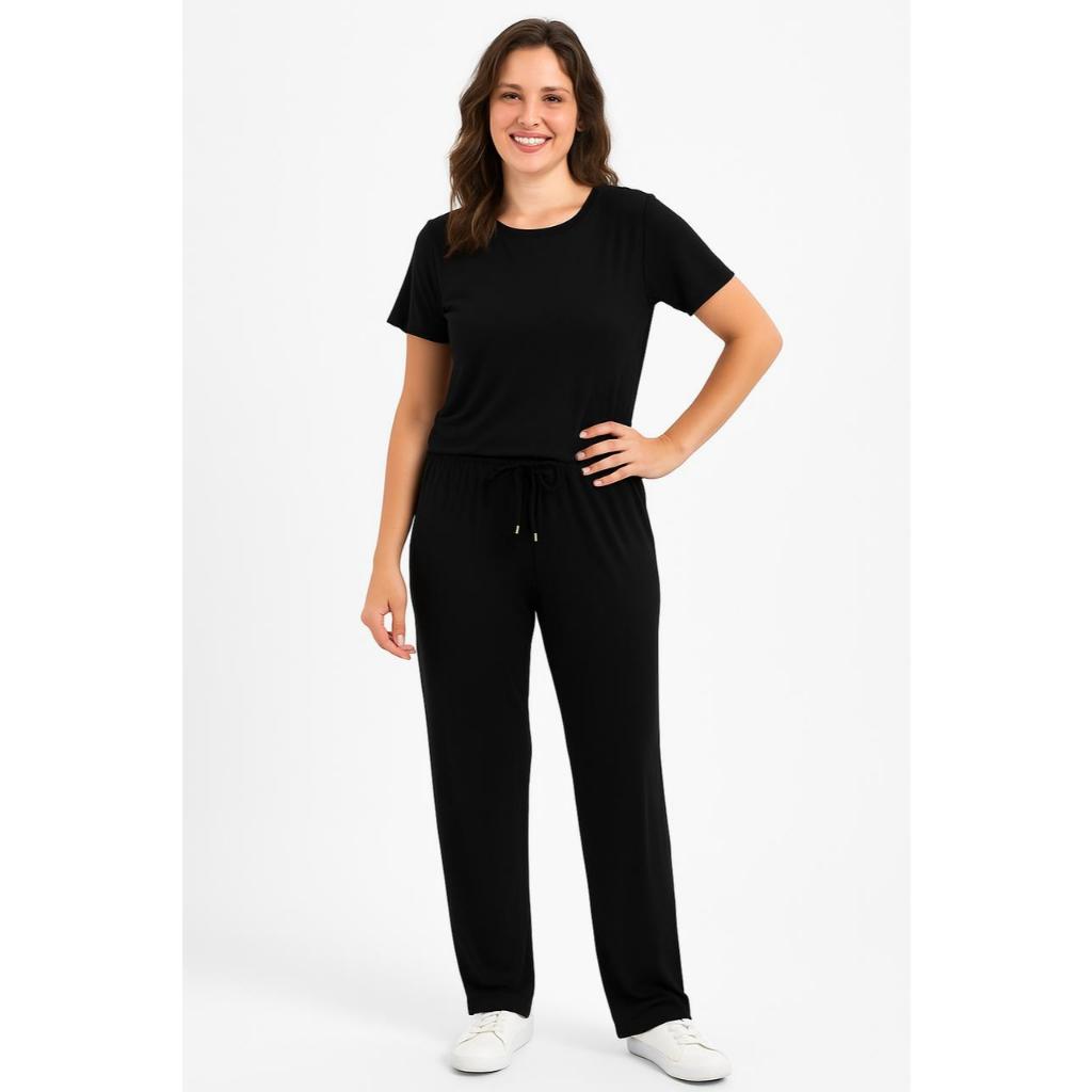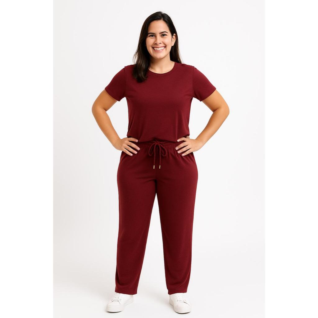 CONJUNTO VISCOLYCRA Feminino Malha Comfy Blusa Camiseta Manga Curta e Calça Cintura Alta Pantalona