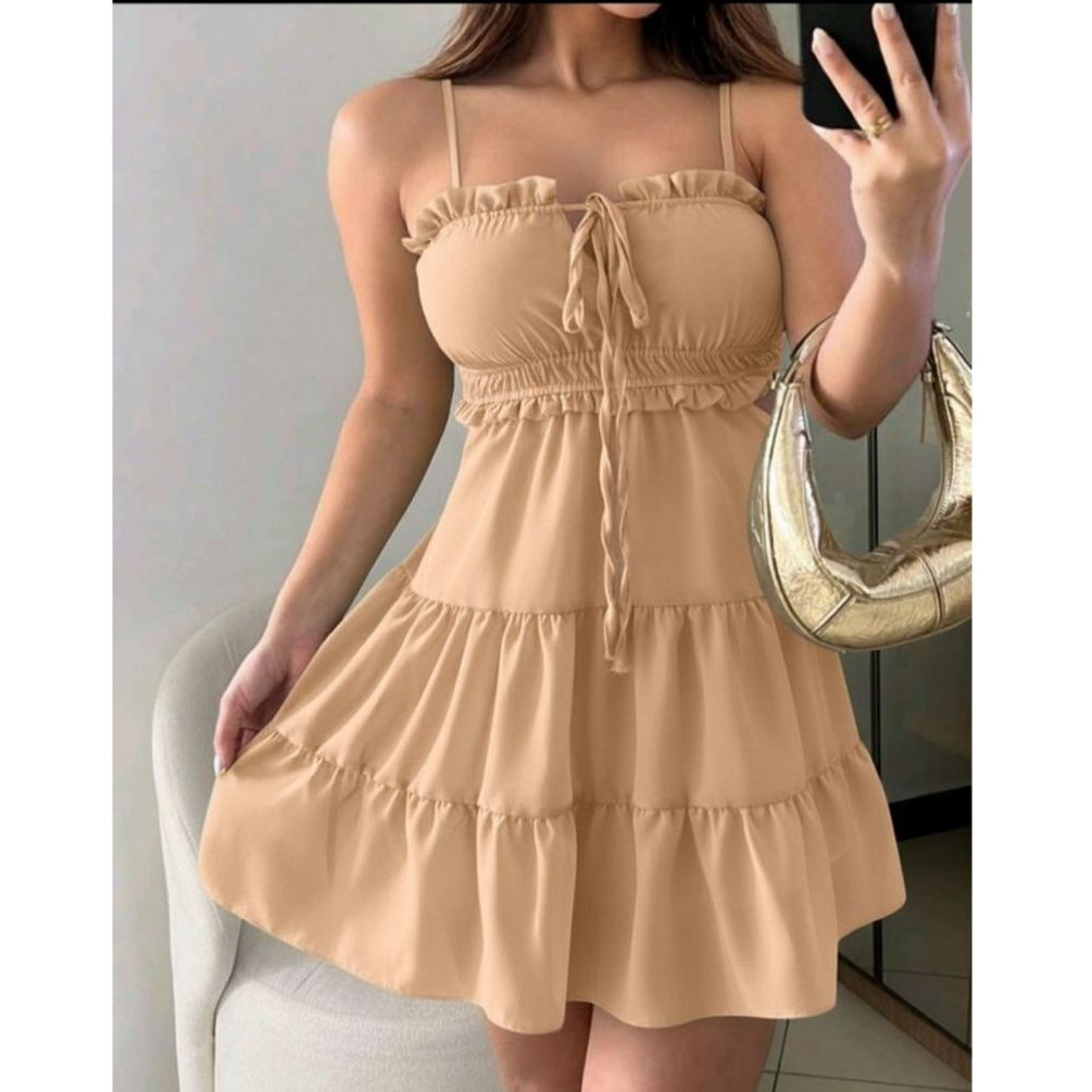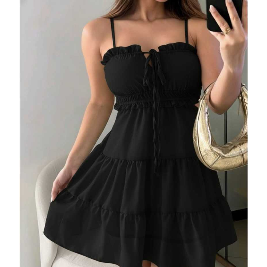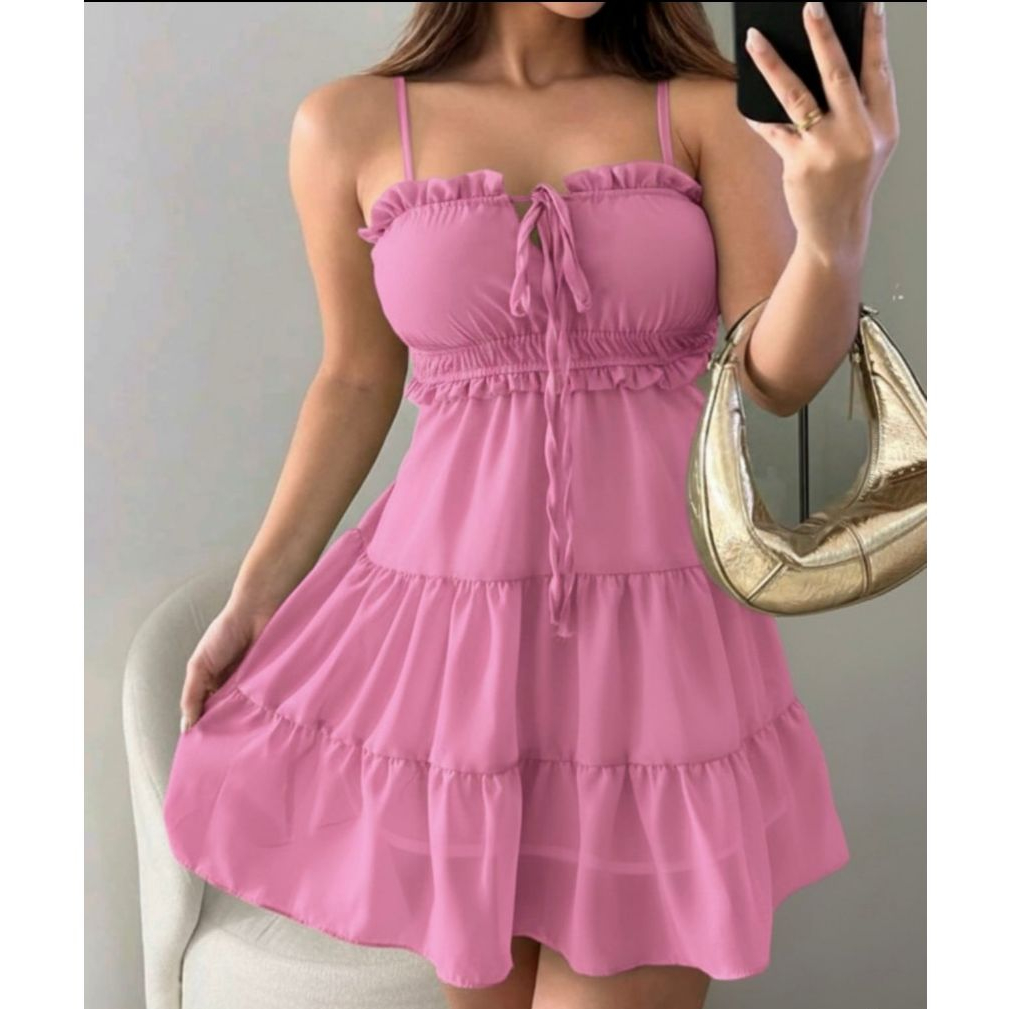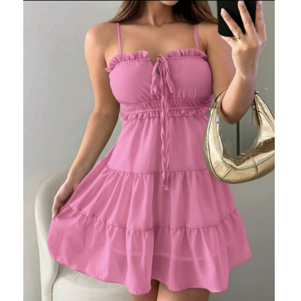 Vestido Curto Chiffon Feminino Rodado Babado Com Forro Alça Fina Laço Delicado Moda Verão Elegante