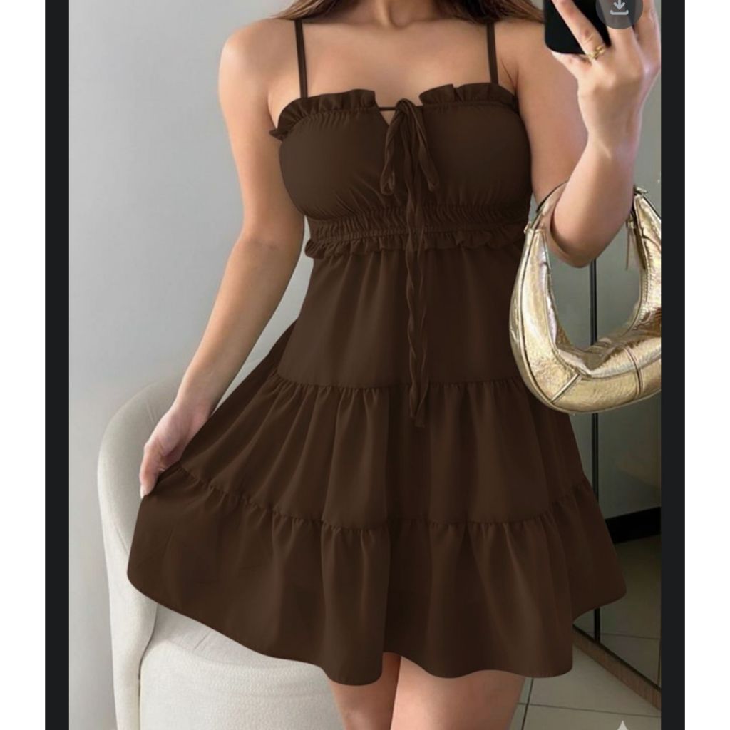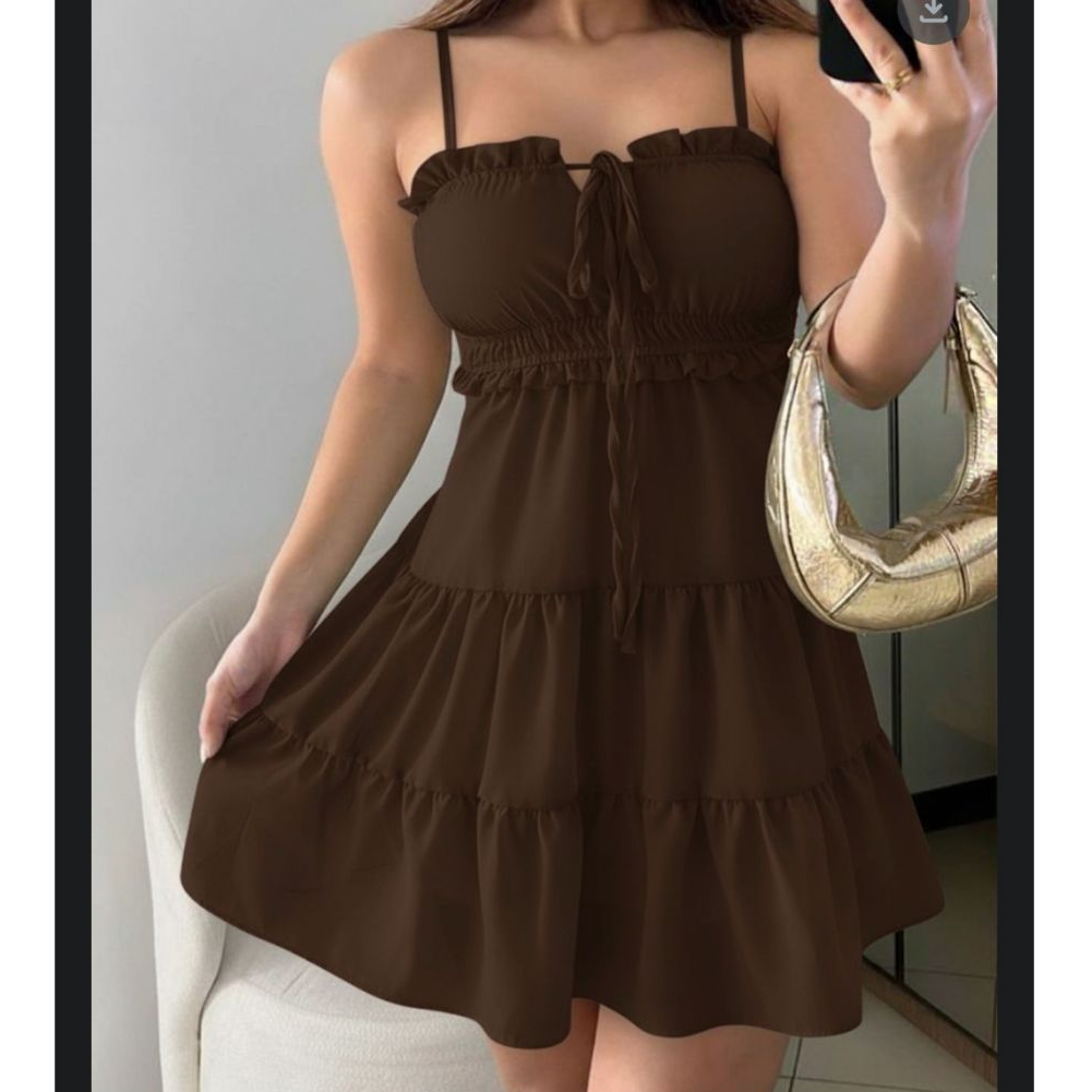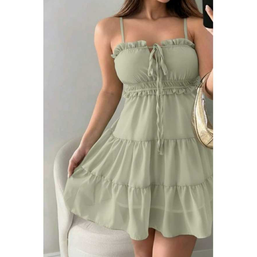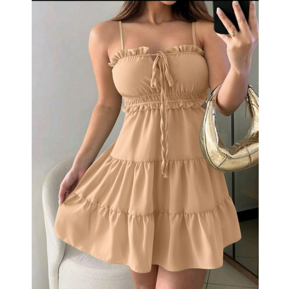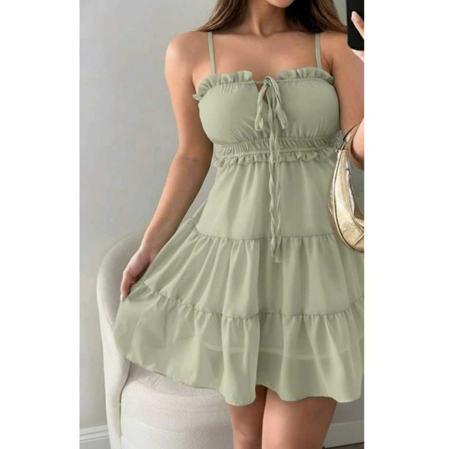 Vestido Curto Chiffon Feminino Rodado Babado Com Forro Alça Fina Laço Delicado Moda Verão Elegante