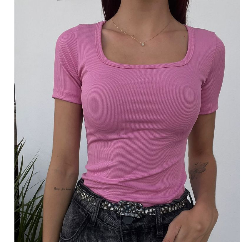 Kit 2 Blusinhas Decote Quadrado Canelada Manga Curta Malha Premium Elegante Básica Promoção