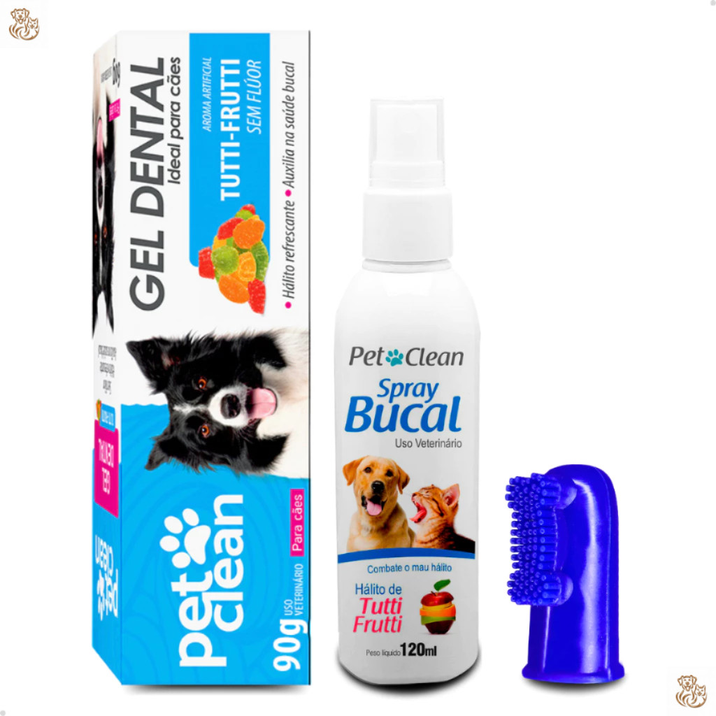 Kit Higiene Gel Pasta Dental 90g + Spray Bucal 120ml + Escova Dente Dedeira Cães e Gatos Pet Clean