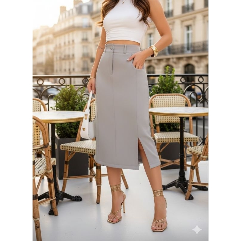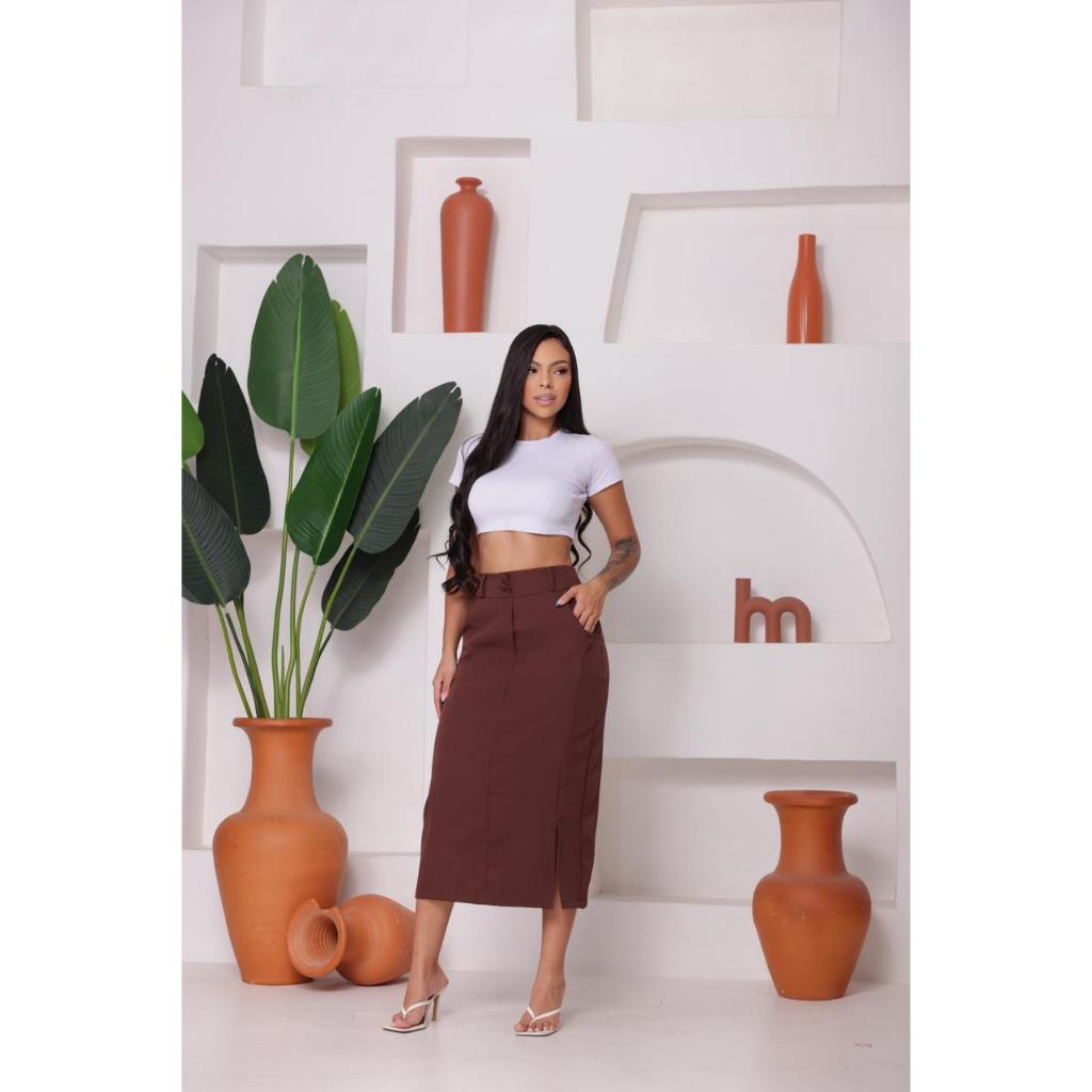 Saia Longa monocromática em alfaiaria , com bolsa laterais e detalhas em ziper e botao