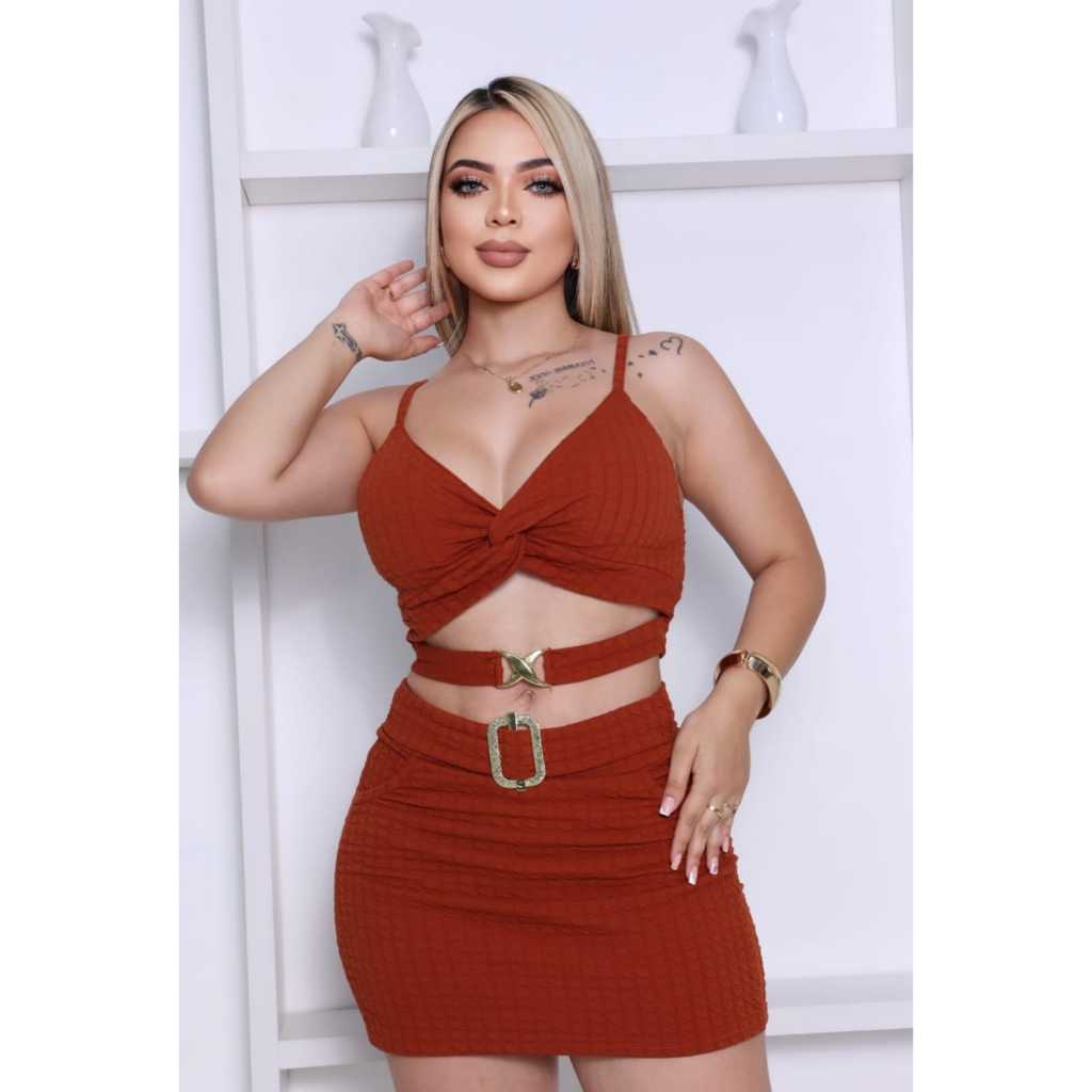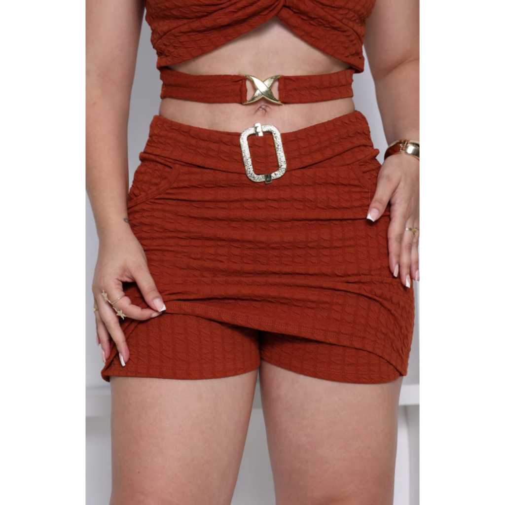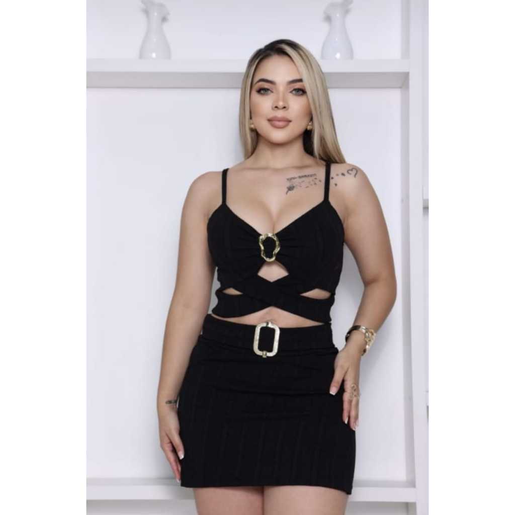 conjunto short saia e top de alcinha com bojo fivelas tecido anna ruga