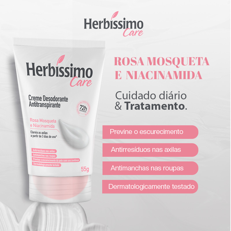 Desodorante Creme Antitranspirante Herbíssimo Bisnaga Rosa Mosqueta e Niacinamida 55g
