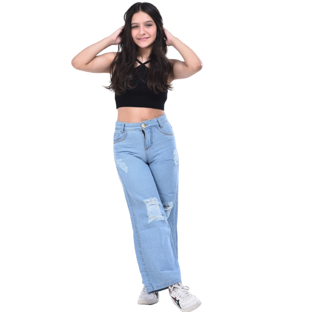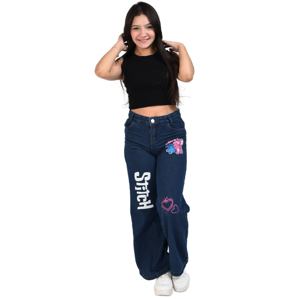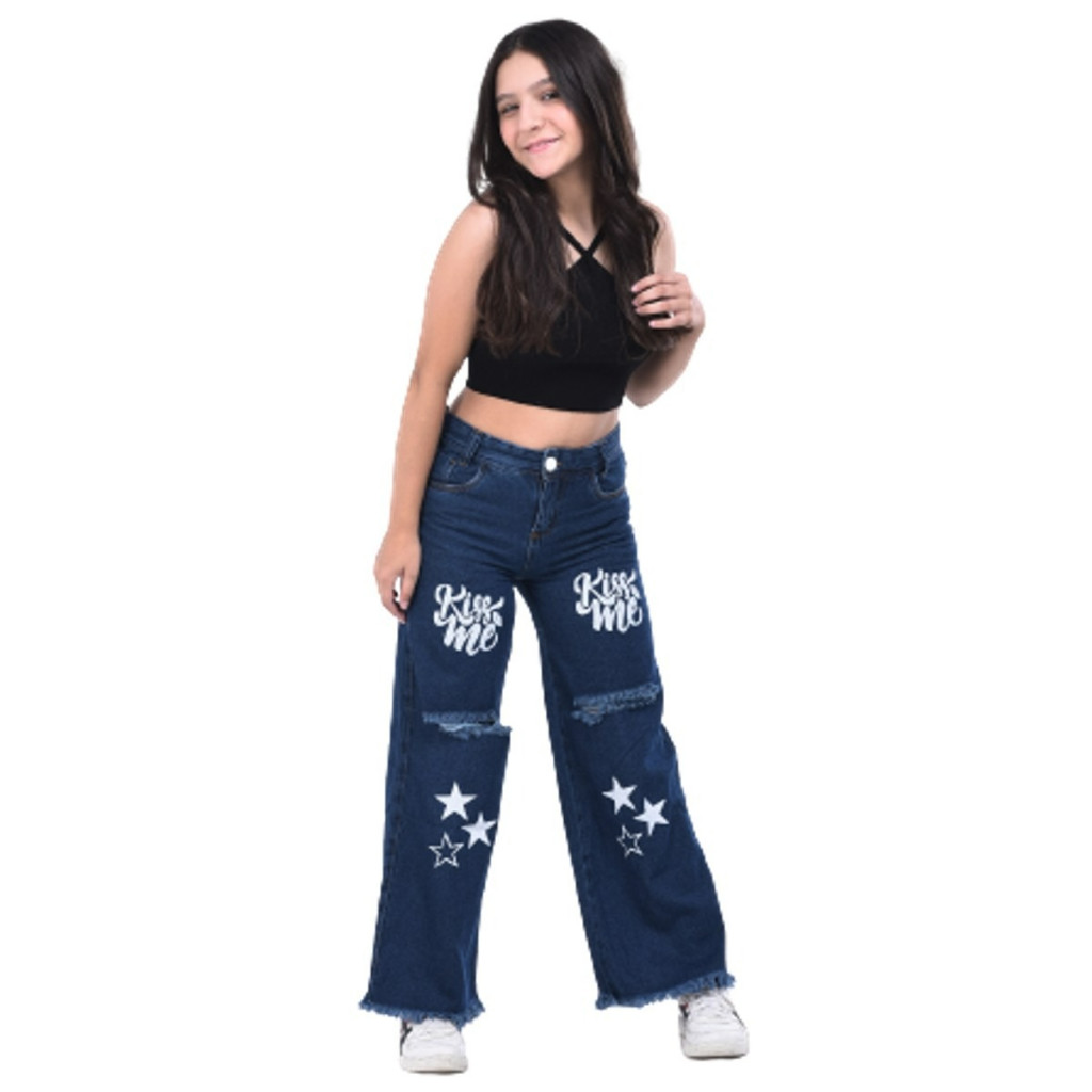 Calça jeans Pantalona wide leg infantil juvenil com escritas estampada