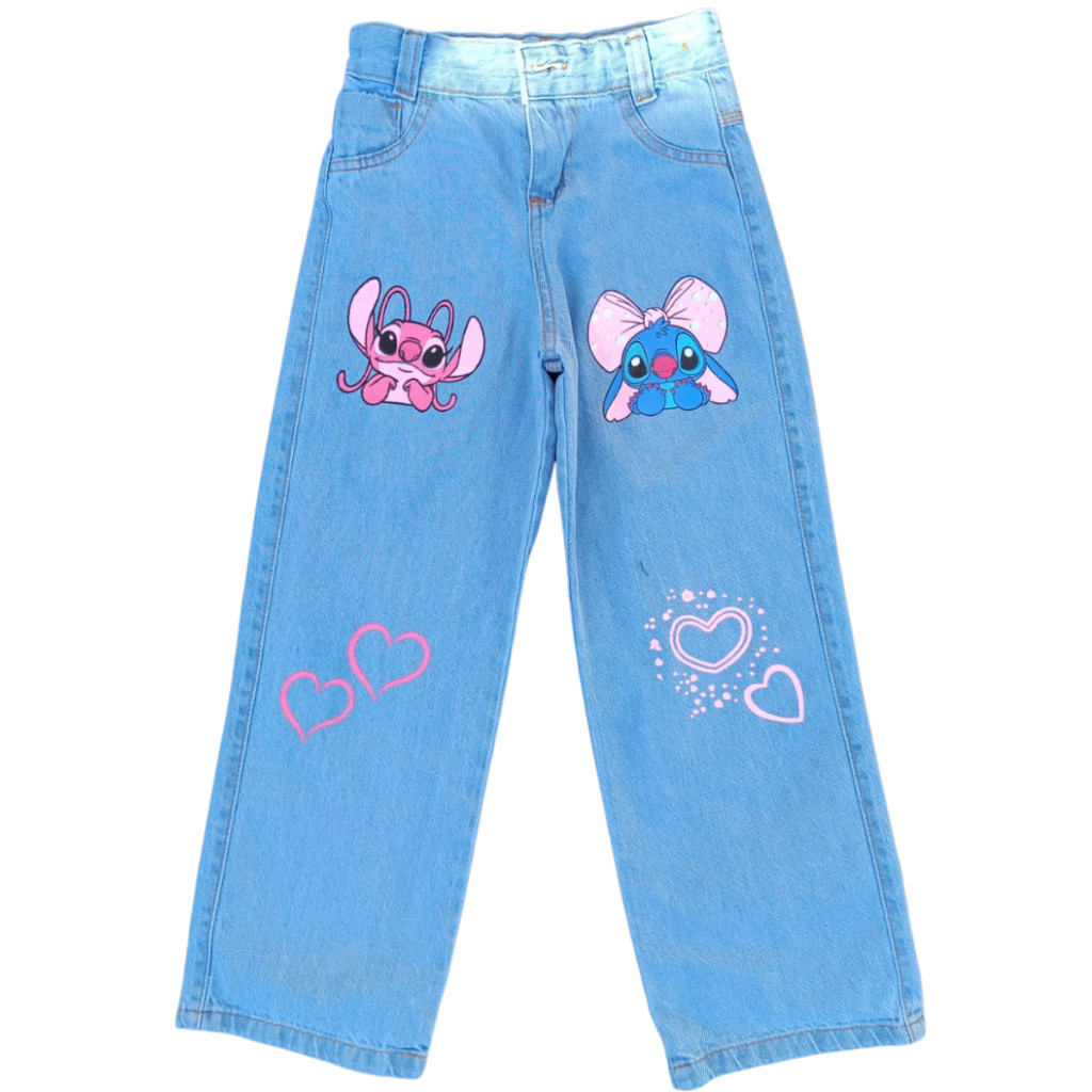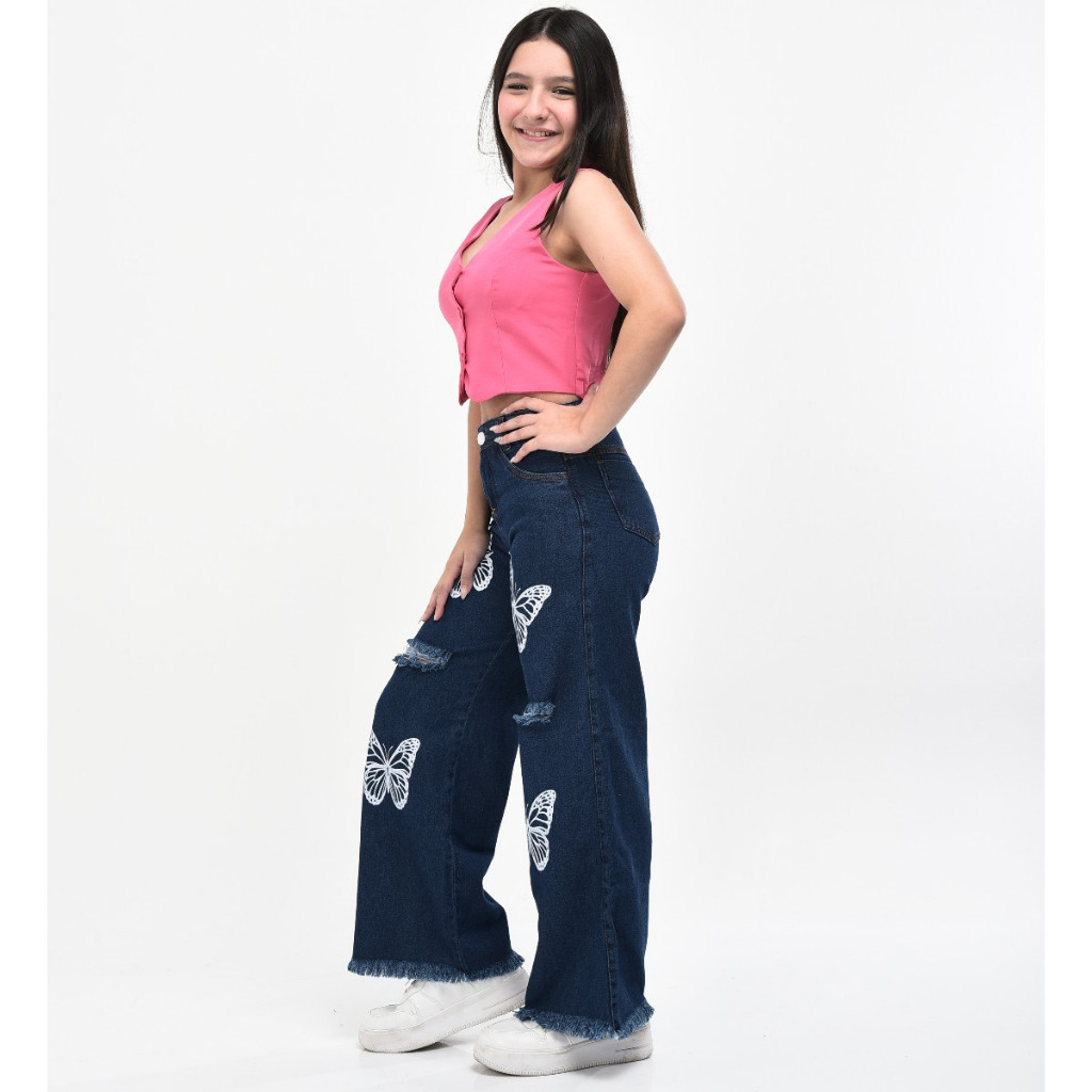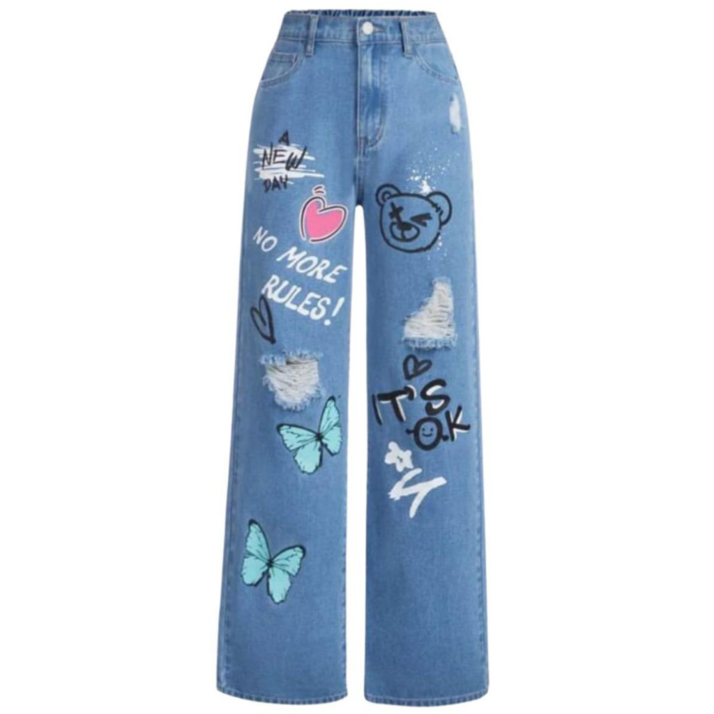 Calça jeans Pantalona wide leg infantil juvenil com escritas estampada