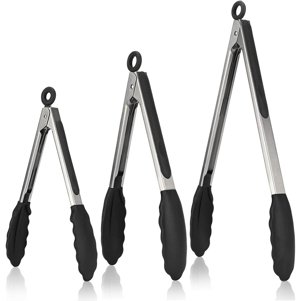 Conjunto de pinças para alimentos em aço inoxidável e silicone (3 pinças em tamanhos diferentes + 2 escovas de silicone)