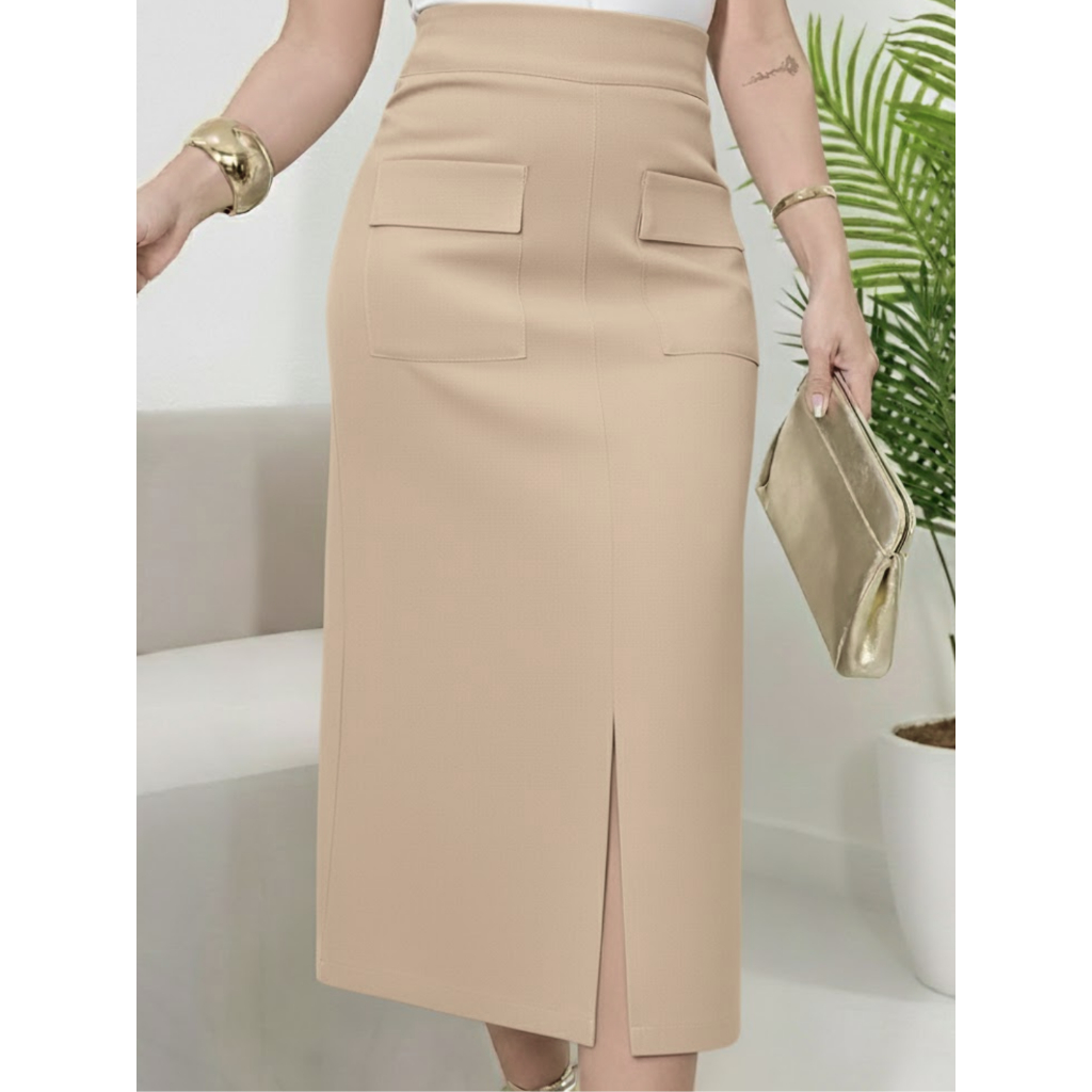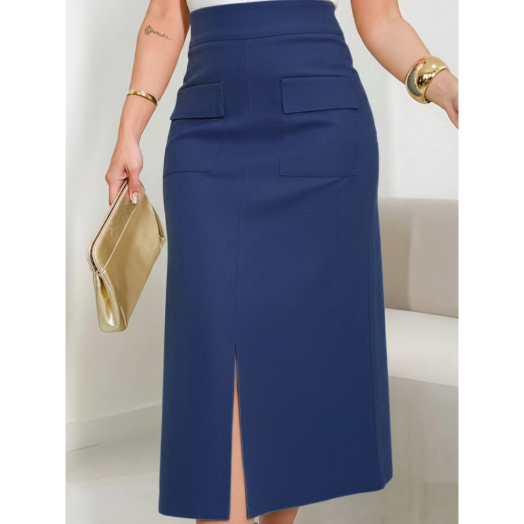 Saia Midi Alfaiataria Linho com Elastano Cintura Alta Fenda Frontal Bolsos