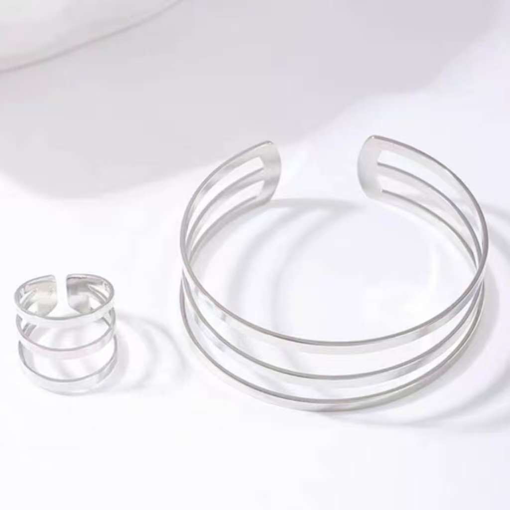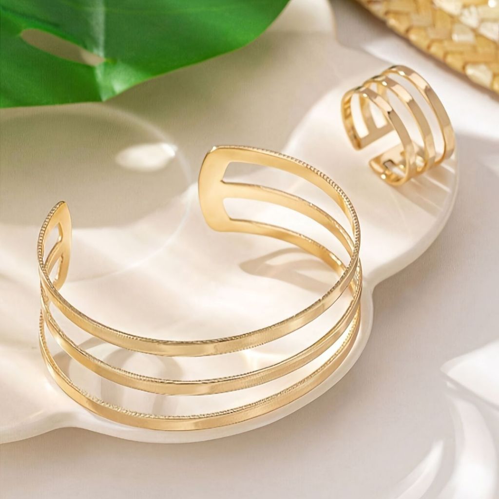 Pulseira e Anel Dourados, Design Aberto e Multicamadas na Cor Ouro - Conjunto Coordenado e Moderno