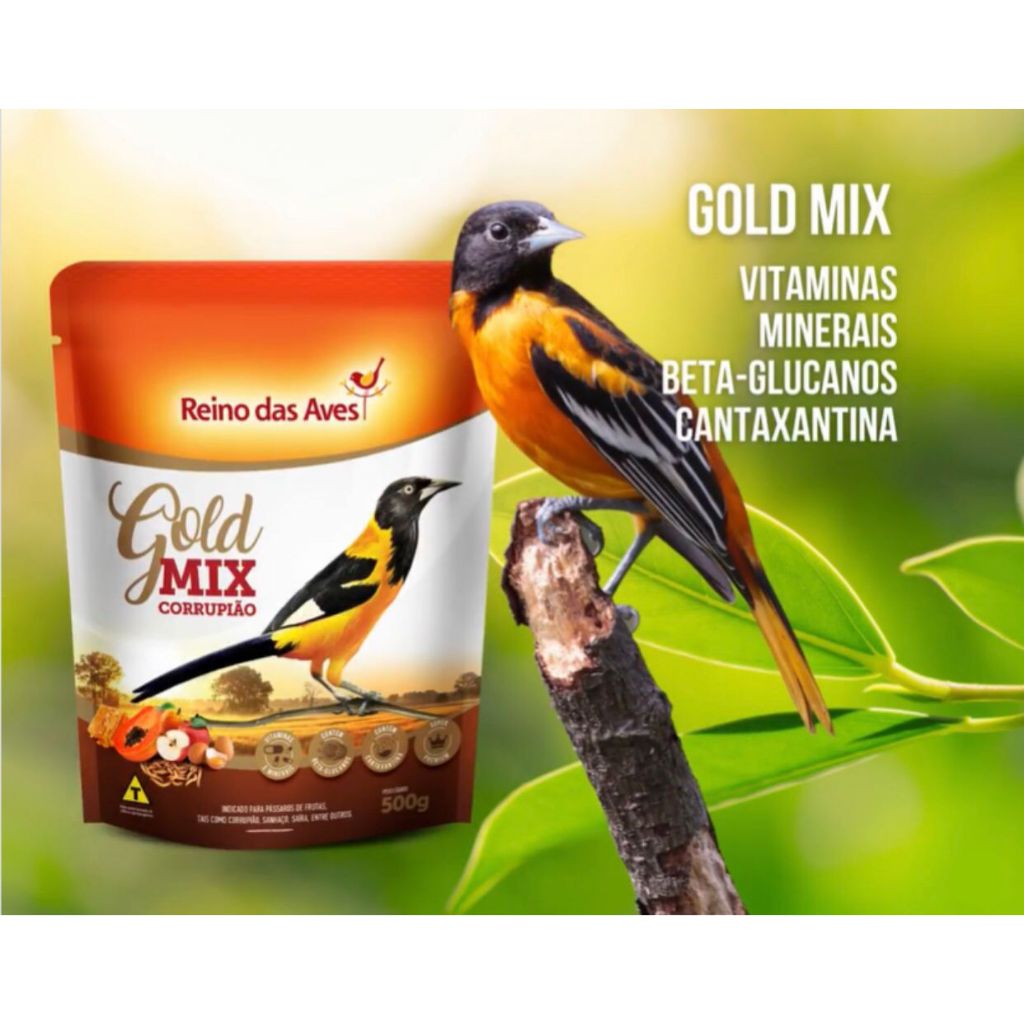 REINO DAS AVES GOLD MIX CORRUPIÃO 500GR RAÇÃO SOFRE CARDIAL ASSANHAÇO TENÉBRIO FRUTA SABIÁ SAÍRA NATIVO SAPORITO BAMBITO