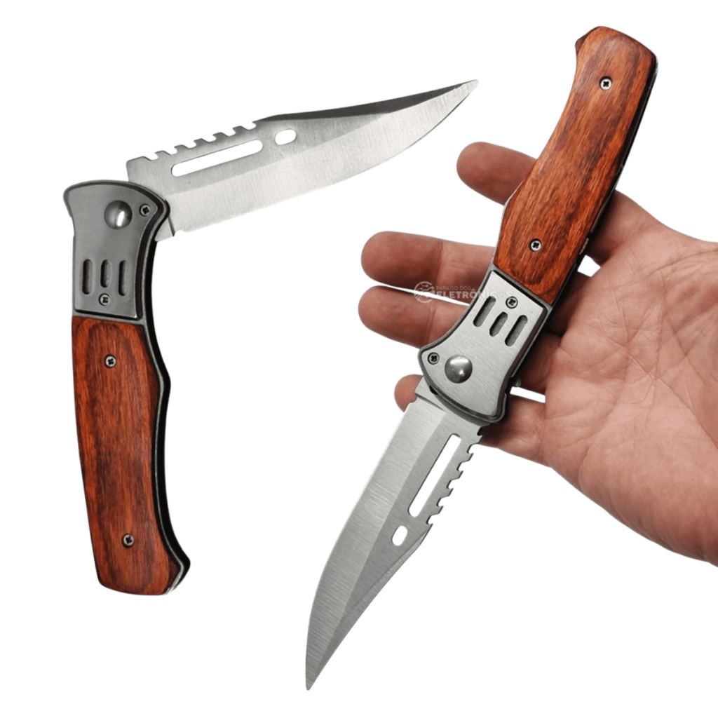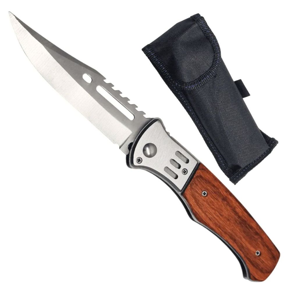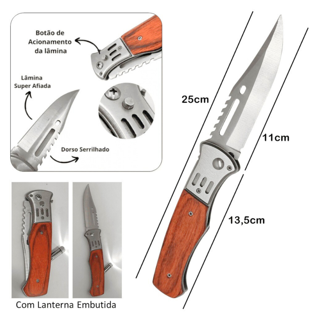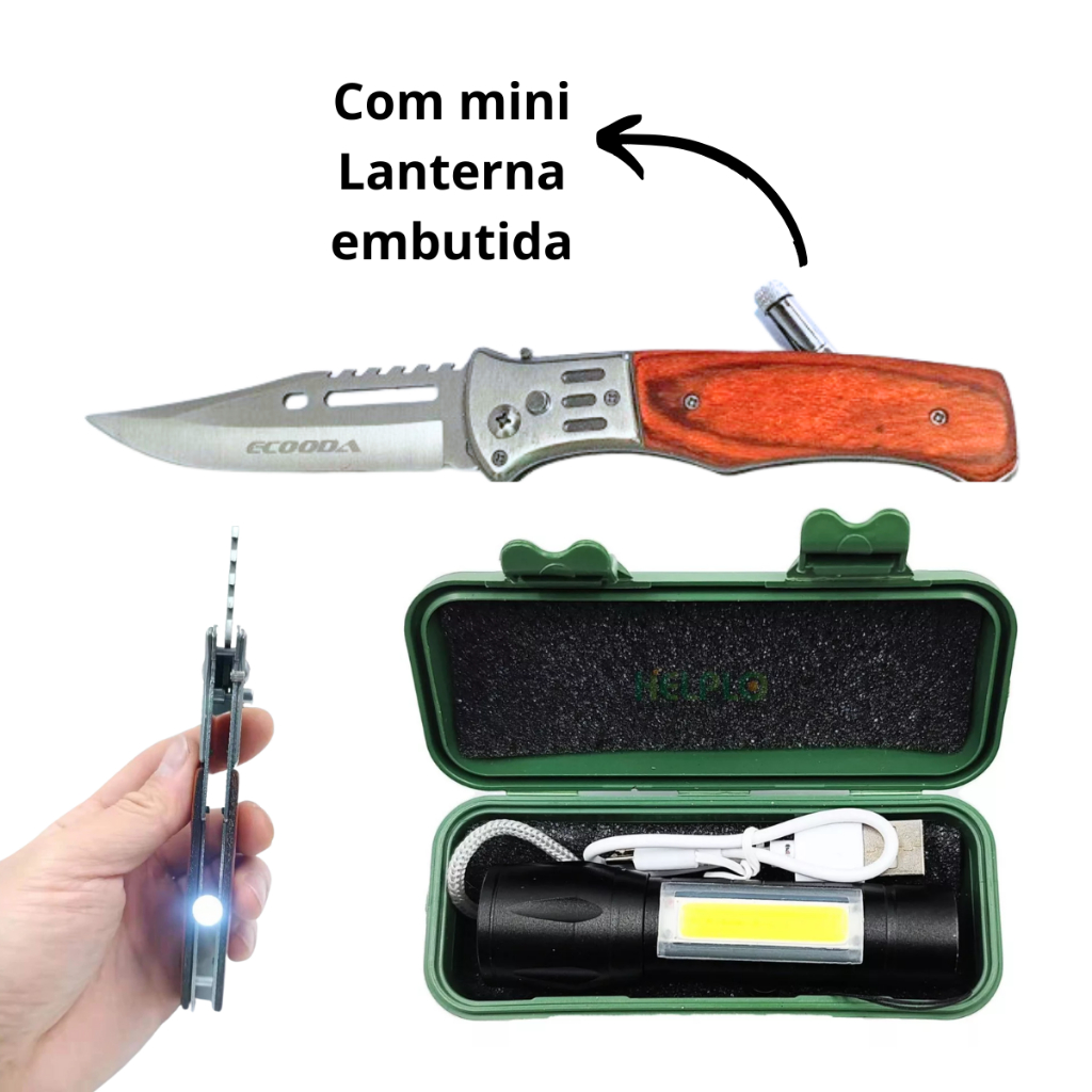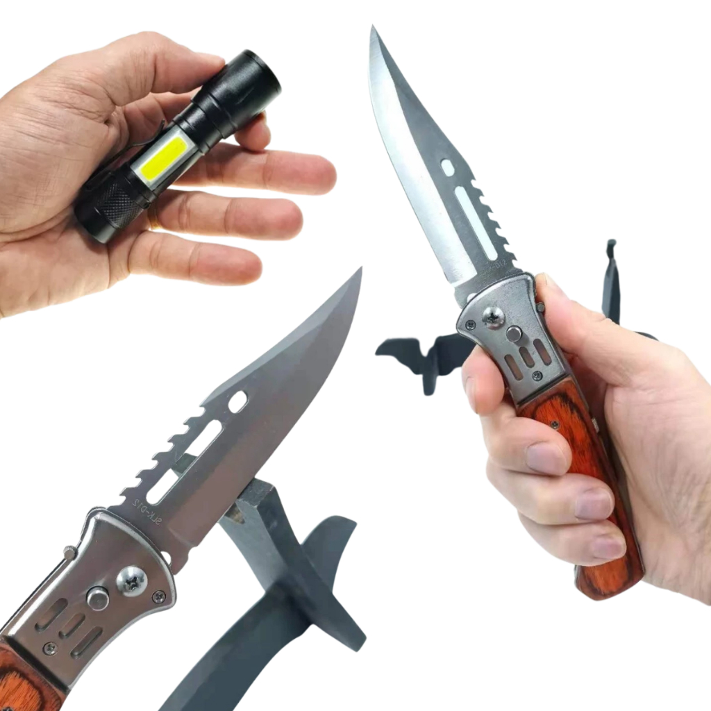 Kit Canivete de Madeira Aço Inox Dobrável Automático + Mini Lanterna +Bainha Tático de Bolso Camping